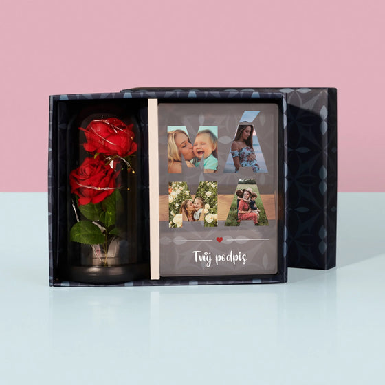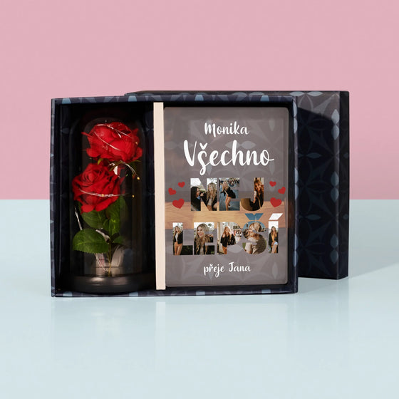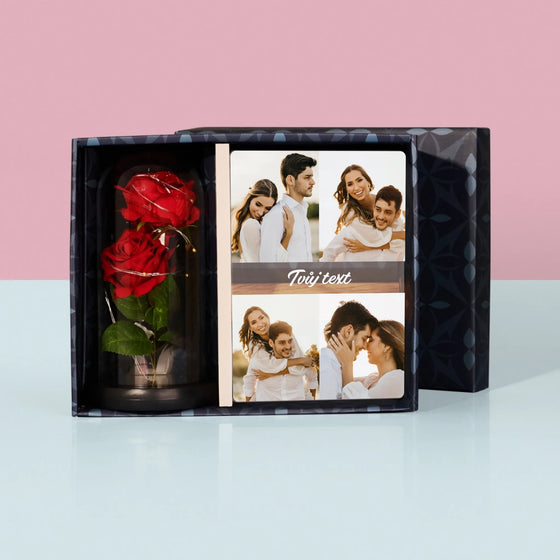 859 KčJednotková cena /Není k dispoziciFotokoláž: 4 Fotky A Nápis - Dárková sada s tiskem na akrylovém skle a věčnou růží