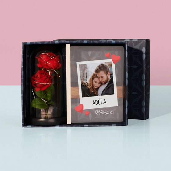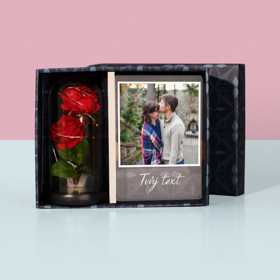 Fotka S Textem: Zamilovaní - Dárková sada s tiskem na akrylovém skle a věčnou růží
