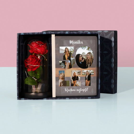 Slovo Z Fotek: 30 Let Z Tvých Fotek - Dárková sada s tiskem na akrylovém skle a věčnou růží