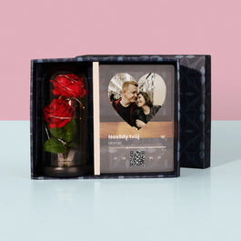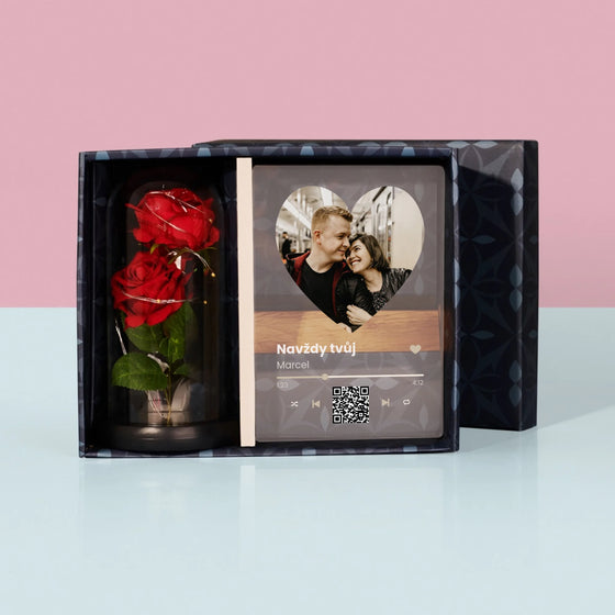859 KčJednotková cena /Není k dispoziciFotka S Textem: Naše Píseň Na Qr - Dárková sada s tiskem na akrylovém skle a věčnou růží
