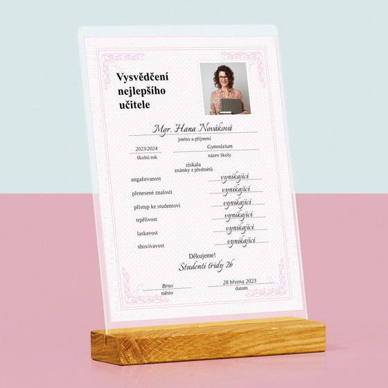 499 KčJednotková cena /Není k dispoziciFotka A Textem: Vysvědčení Nejlepšího Učitele - Tisk na akrylovém skle LED