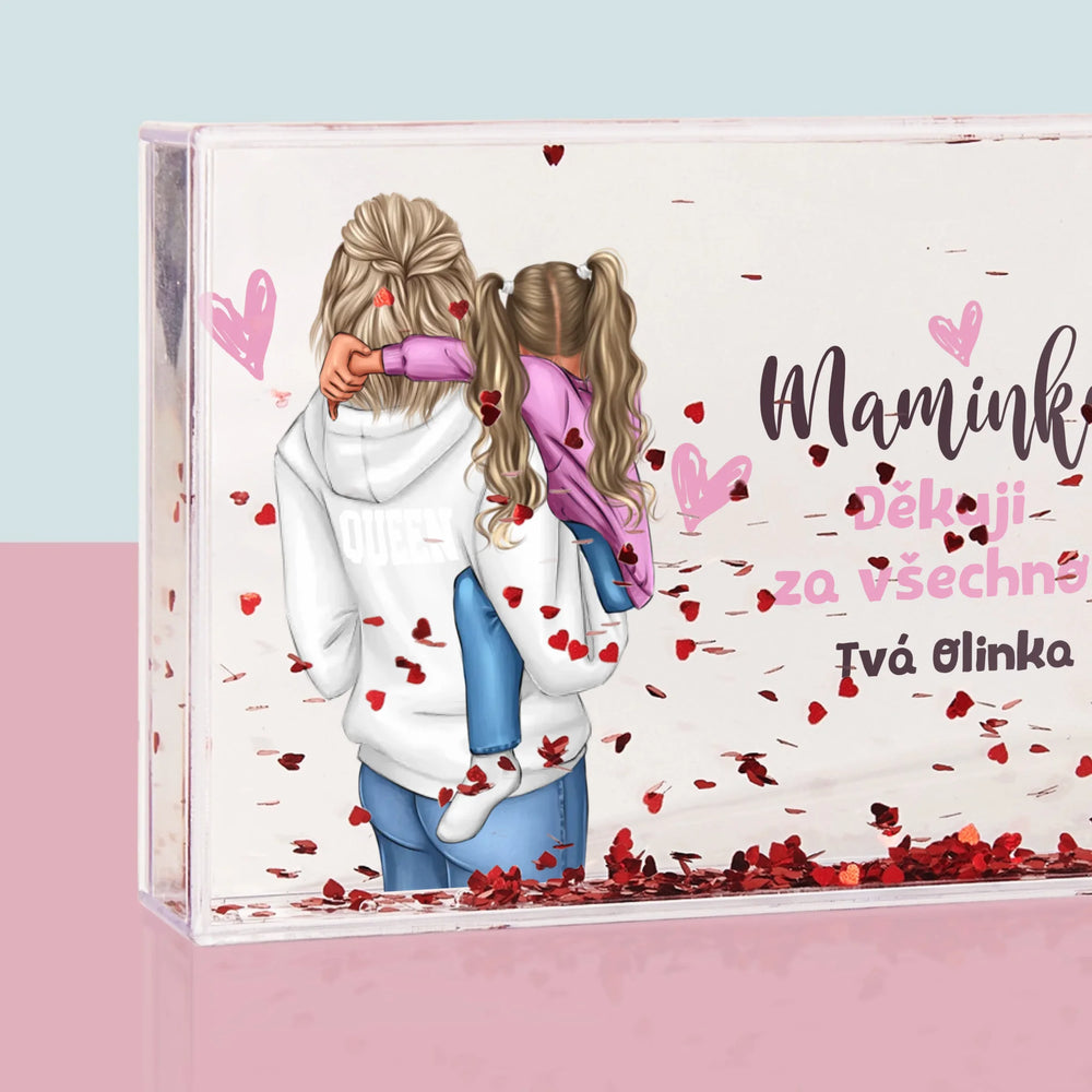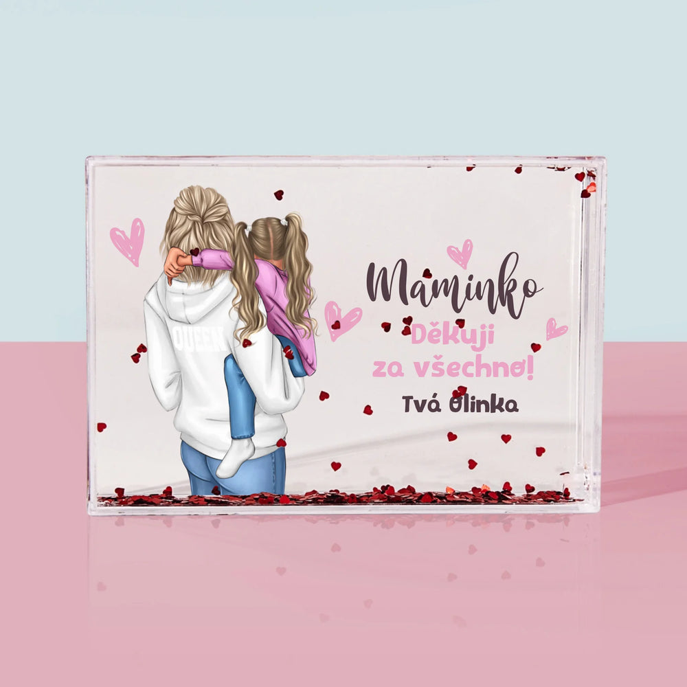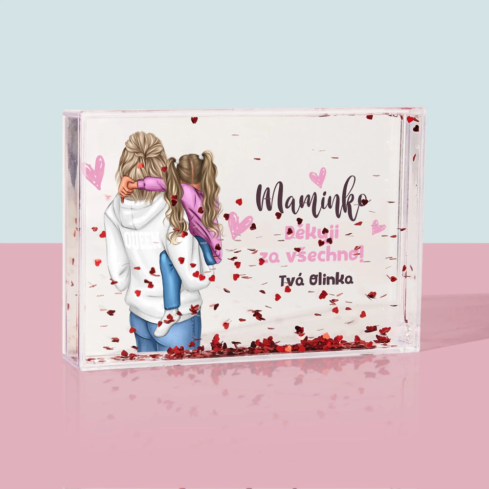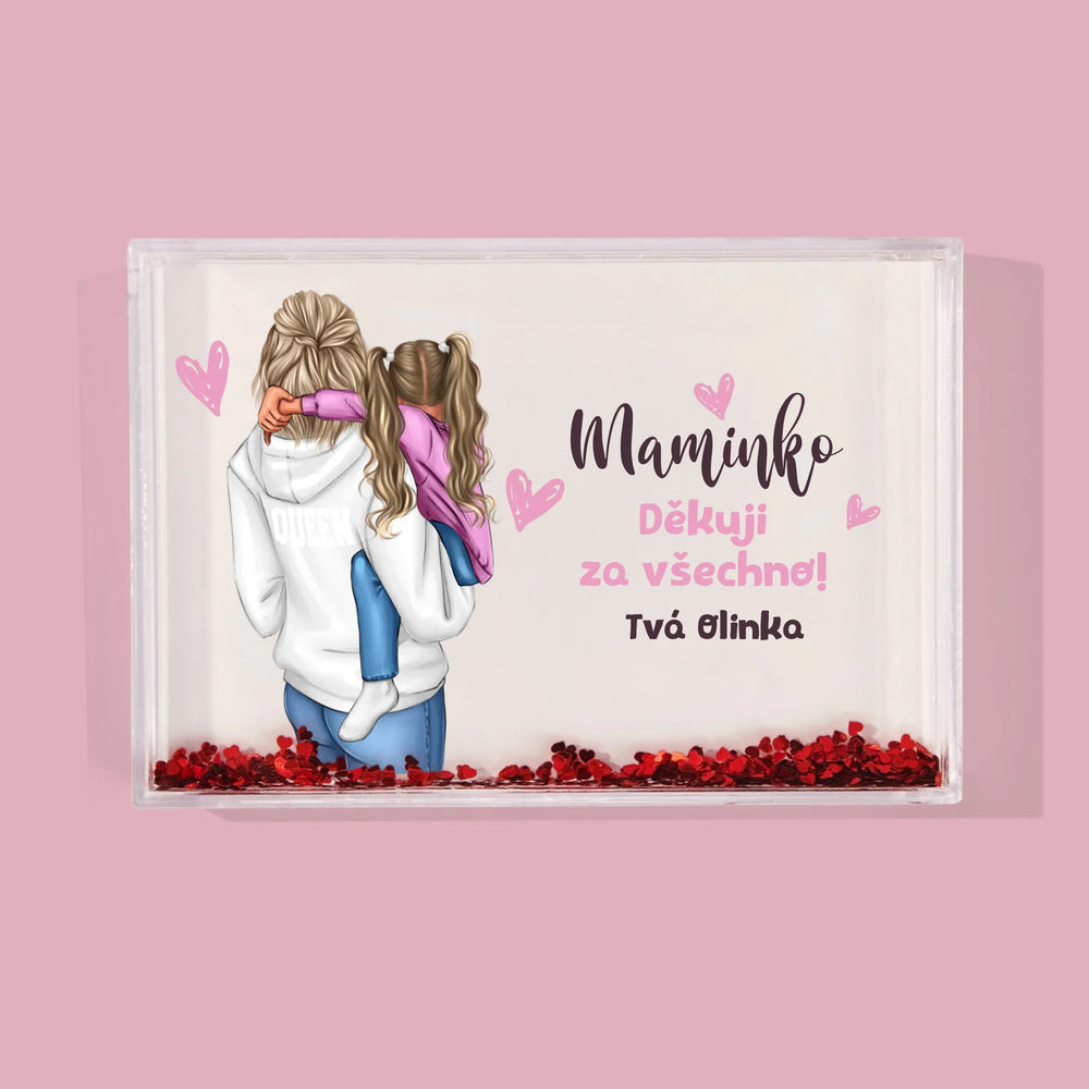 Sněžítko je vyrobeno z průhledného plastu, uvnitř je naplněno vodou a konfetami ve tvaru srdíček!