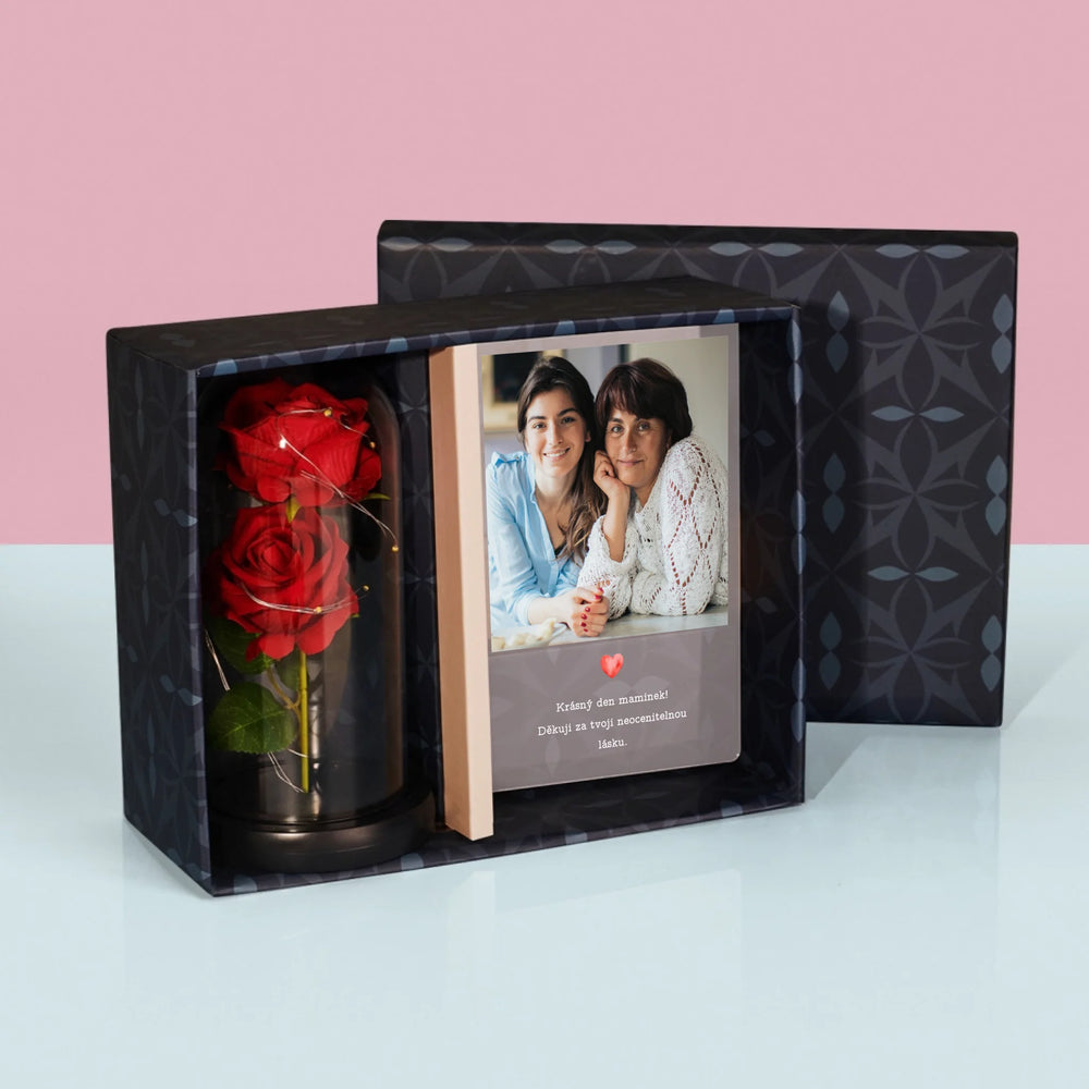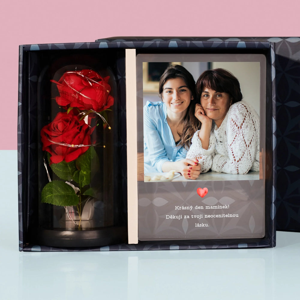 • Dárková sada s tiskem na akrylovém skle a věčnou růží