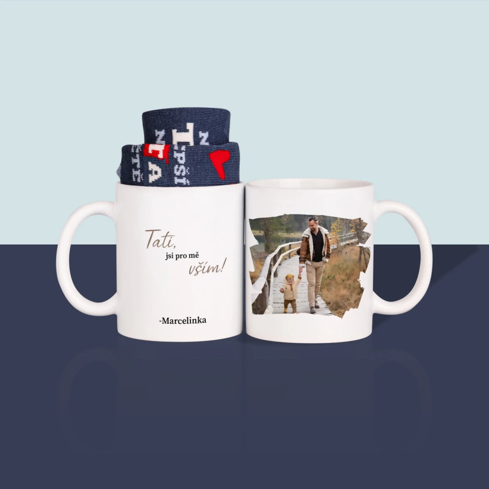 Kvalitní hrnek s personalizací podle vašeho výběru a ponožkami pro tátu uvnitř.