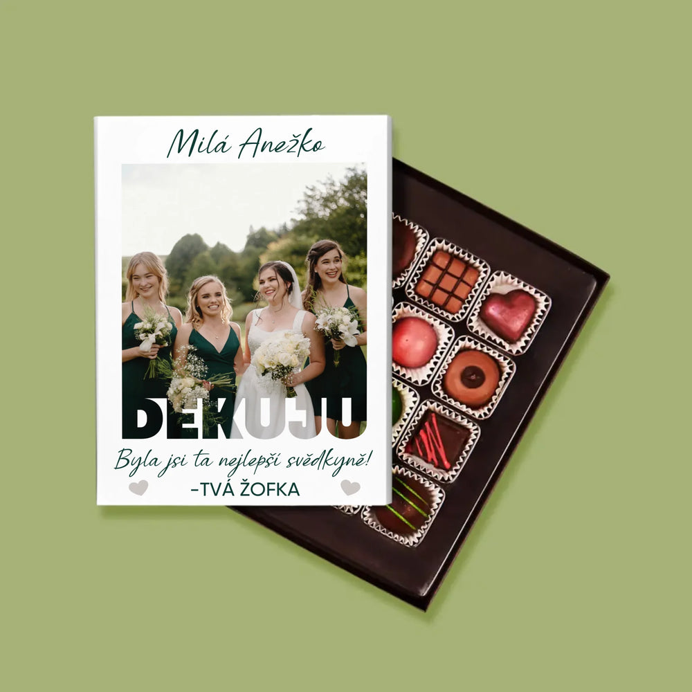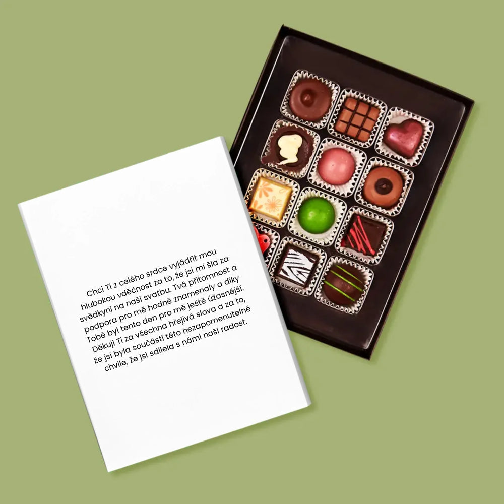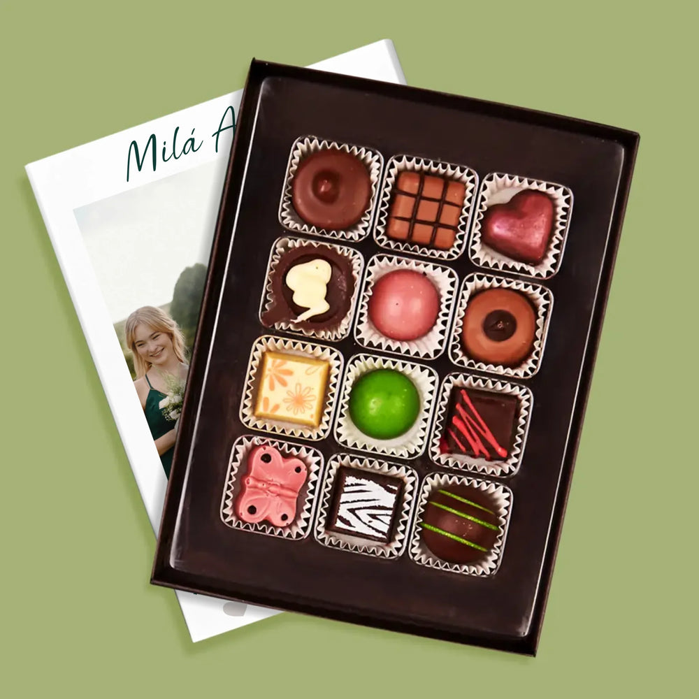 • Lahodné belgické čokoládové pralinky v elegantní Krabici s naší vlastní personalizací.