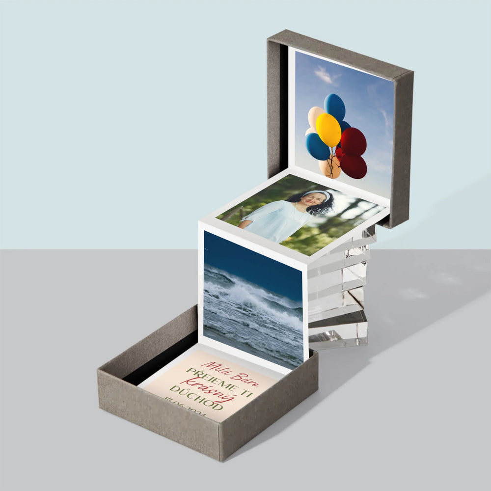 Sada harmoniky se třemi fotografiemi o rozměrech 6,68 x 6,68 cm a personalizovanými kartami s nápisem pro obdarovaného.