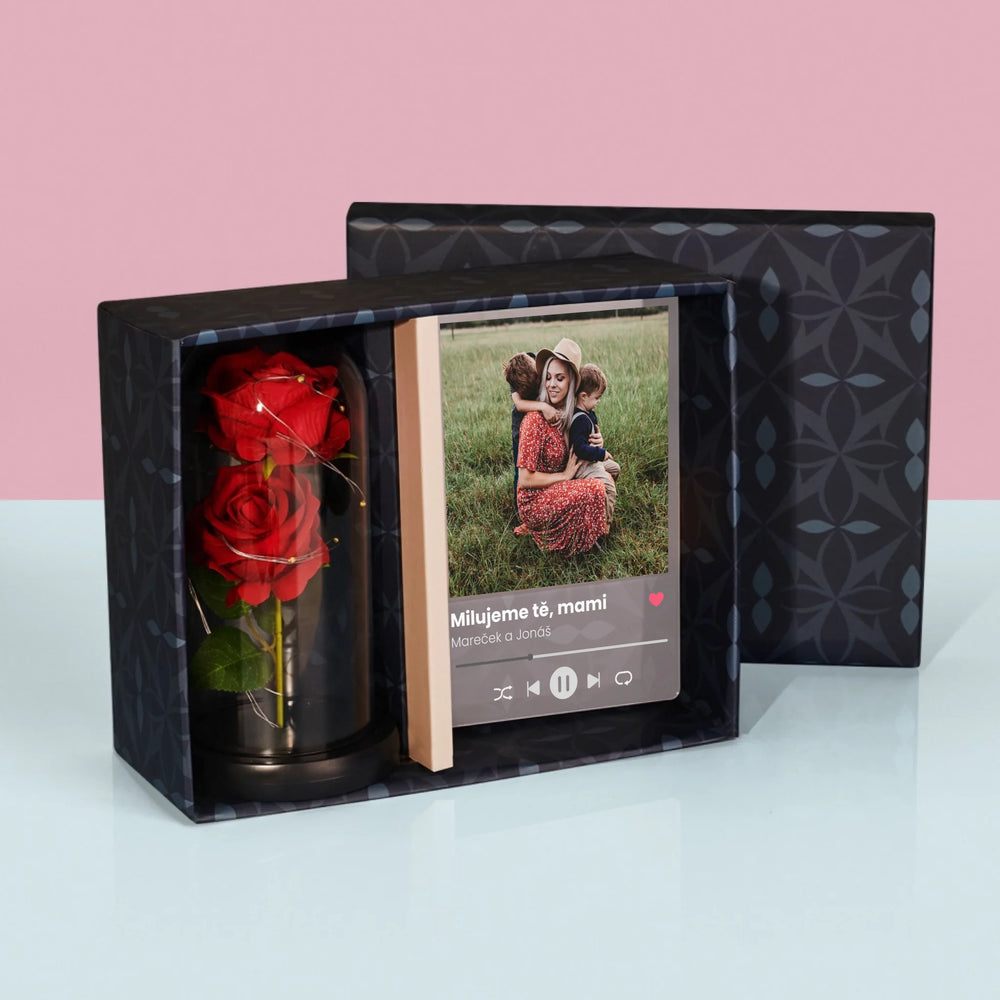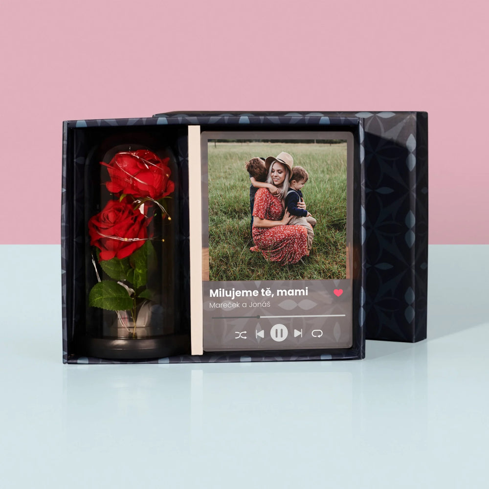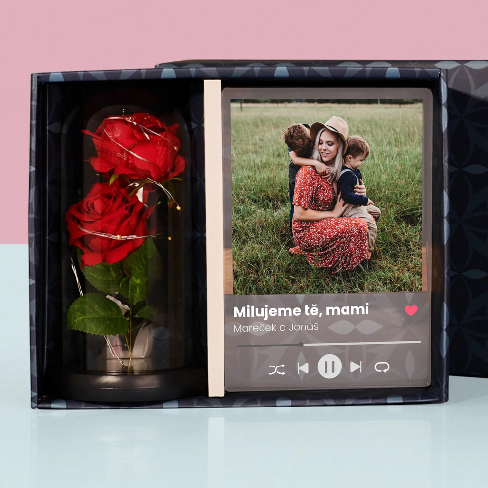Fotka S Textem: Milujeme Tě, Mami - Dárková sada s tiskem na akrylovém skle a věčnou růží