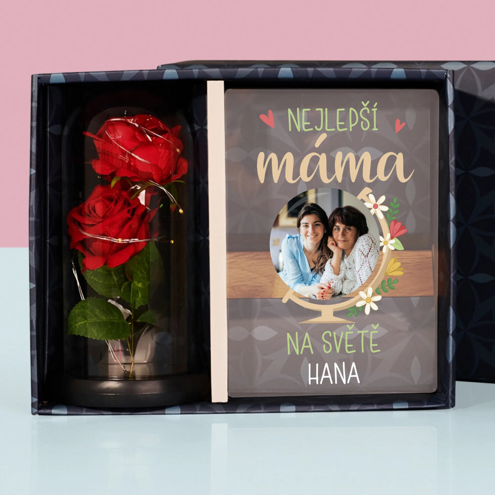 Fotka S Textem: Nejlepší Máma Svět - Dárková sada s tiskem na akrylovém skle a věčnou růží