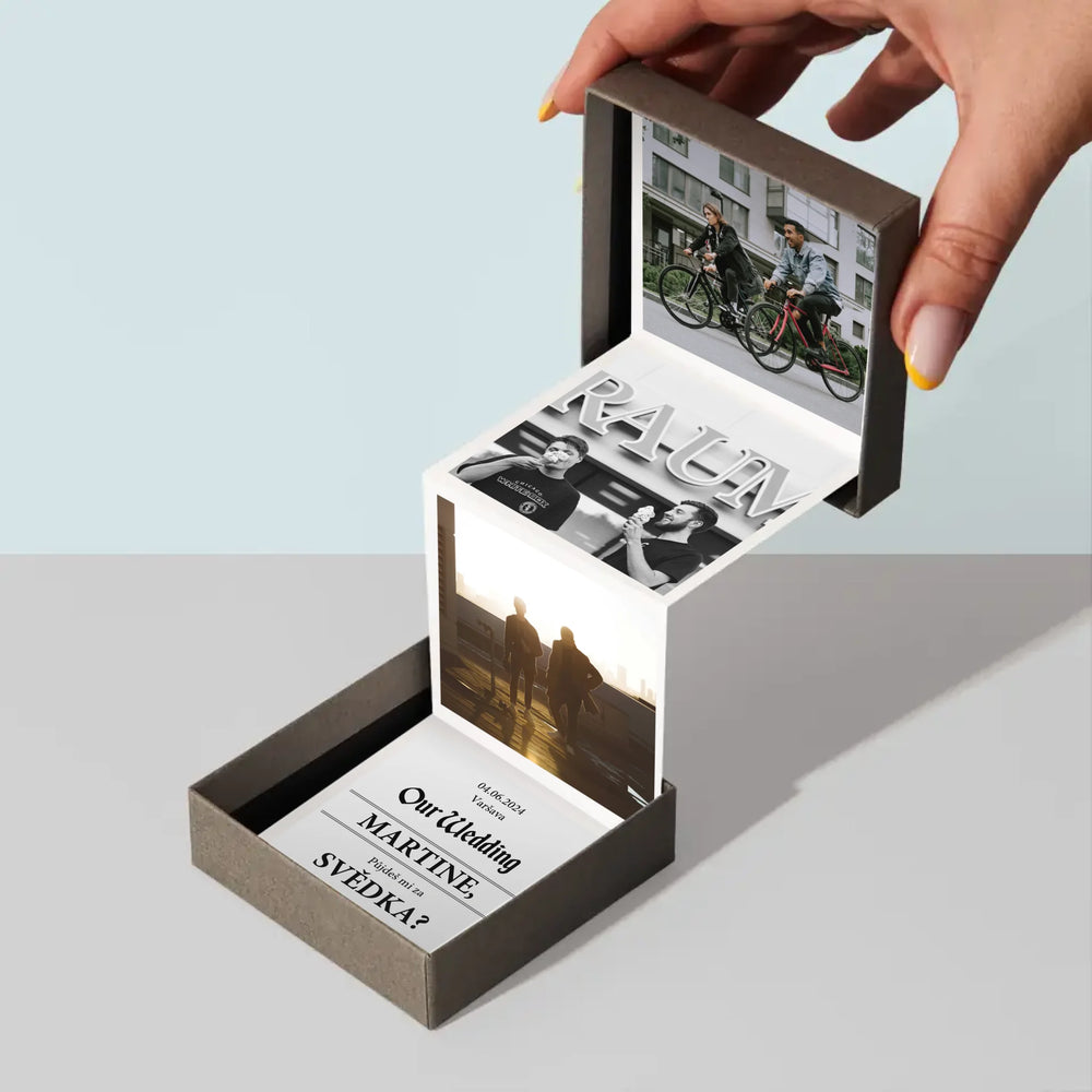 Sada harmoniky se třemi fotografiemi o rozměrech 6,68 x 6,68 cm a personalizovanými kartami s nápisem pro obdarovaného.