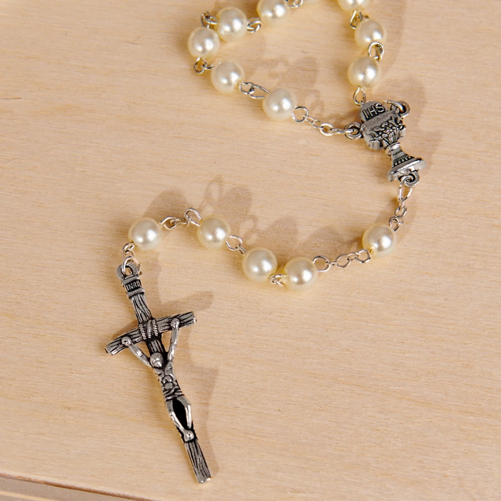 • Rozměry a provedení růžence: délka (včetně křížku): 46,5 cm, délka křížku: 46,5 cm, délka křížku: 46,5 cm, délka křížku: 46,5 cm: 4 cm, průměr kuličky: 6 mm; materiál: nerezová ocel, sklo, perleťový potah.
