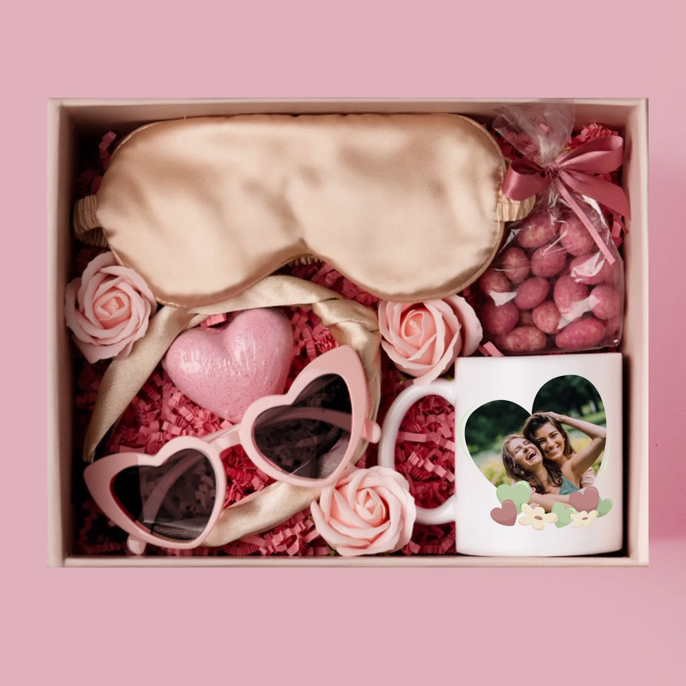 Sada obsahuje mandle v čokoládě, koupelovou bombu ve tvaru srdce, oční masku, brýle ve tvaru srdce a mydlové růže.