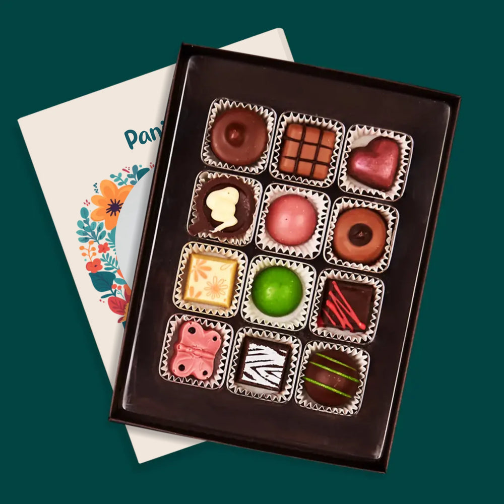 Lahodné belgické čokoládové pralinky v elegantní Krabici s naší vlastní personalizací.