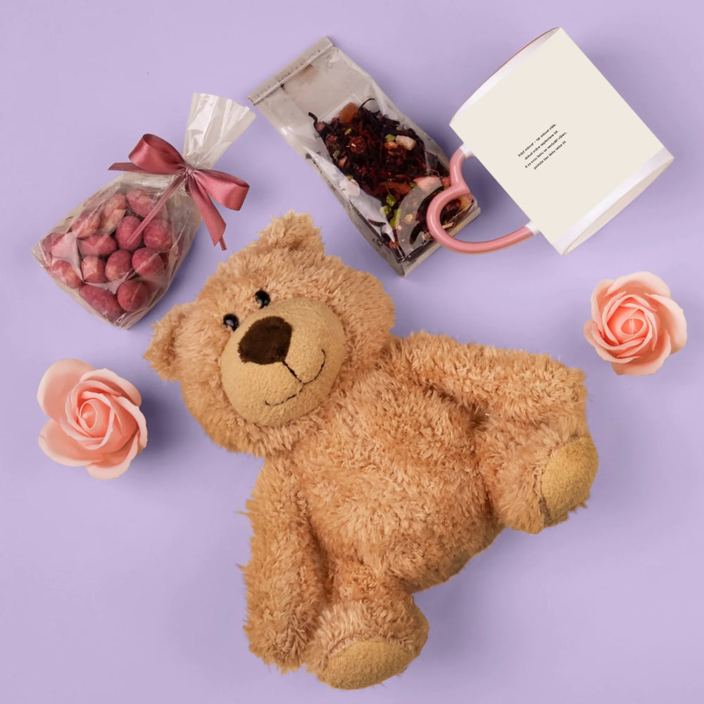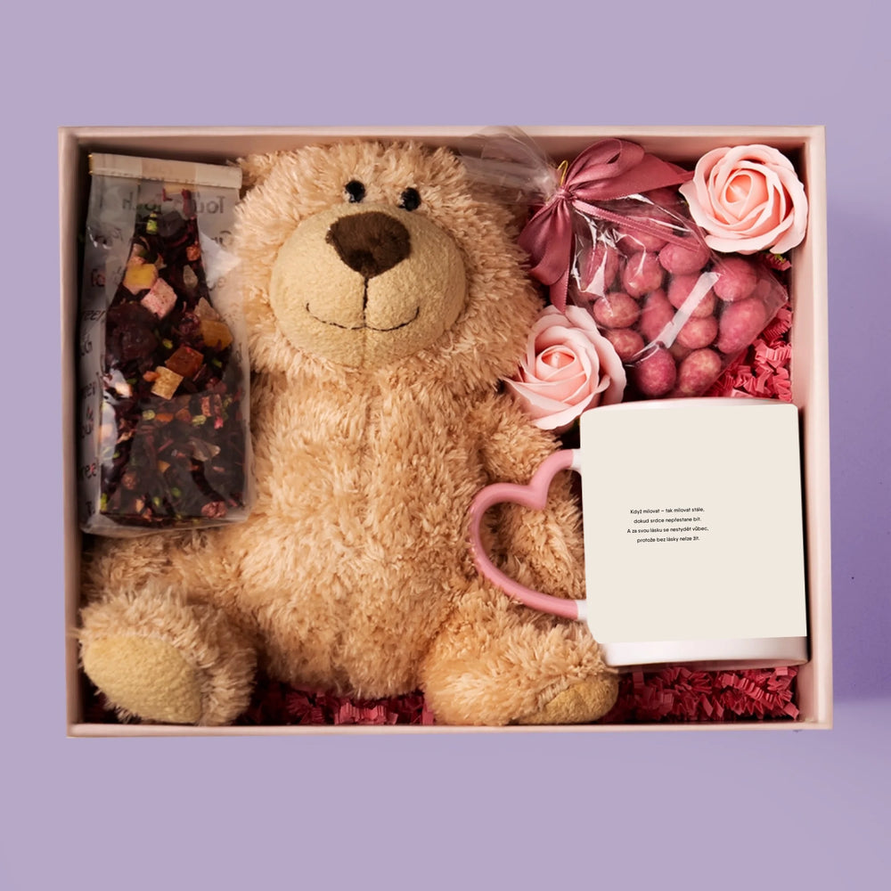 Sada obsahuje mandle v čokoládě, vovocný čaj, mýdlové růže a plyšového medvídka.