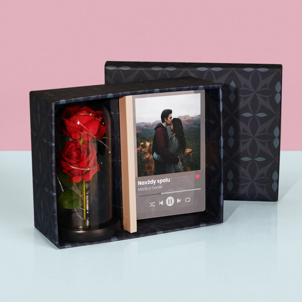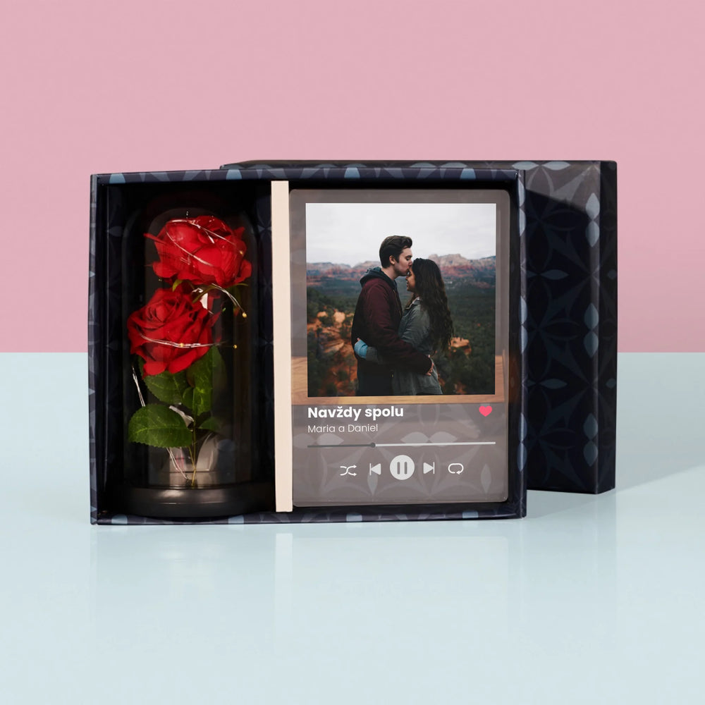 Fotka S Textem: Spotify S Vlastní Fotkou - Dárková sada s tiskem na akrylovém skle a věčnou růží
