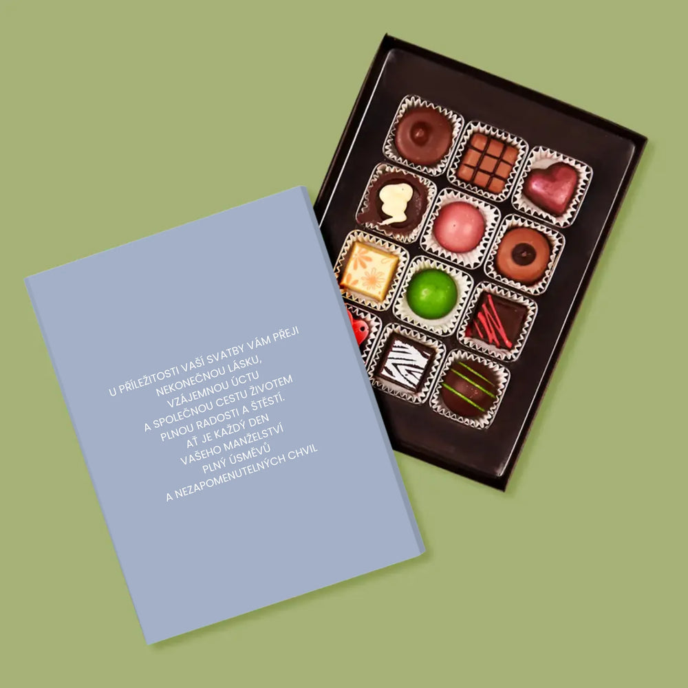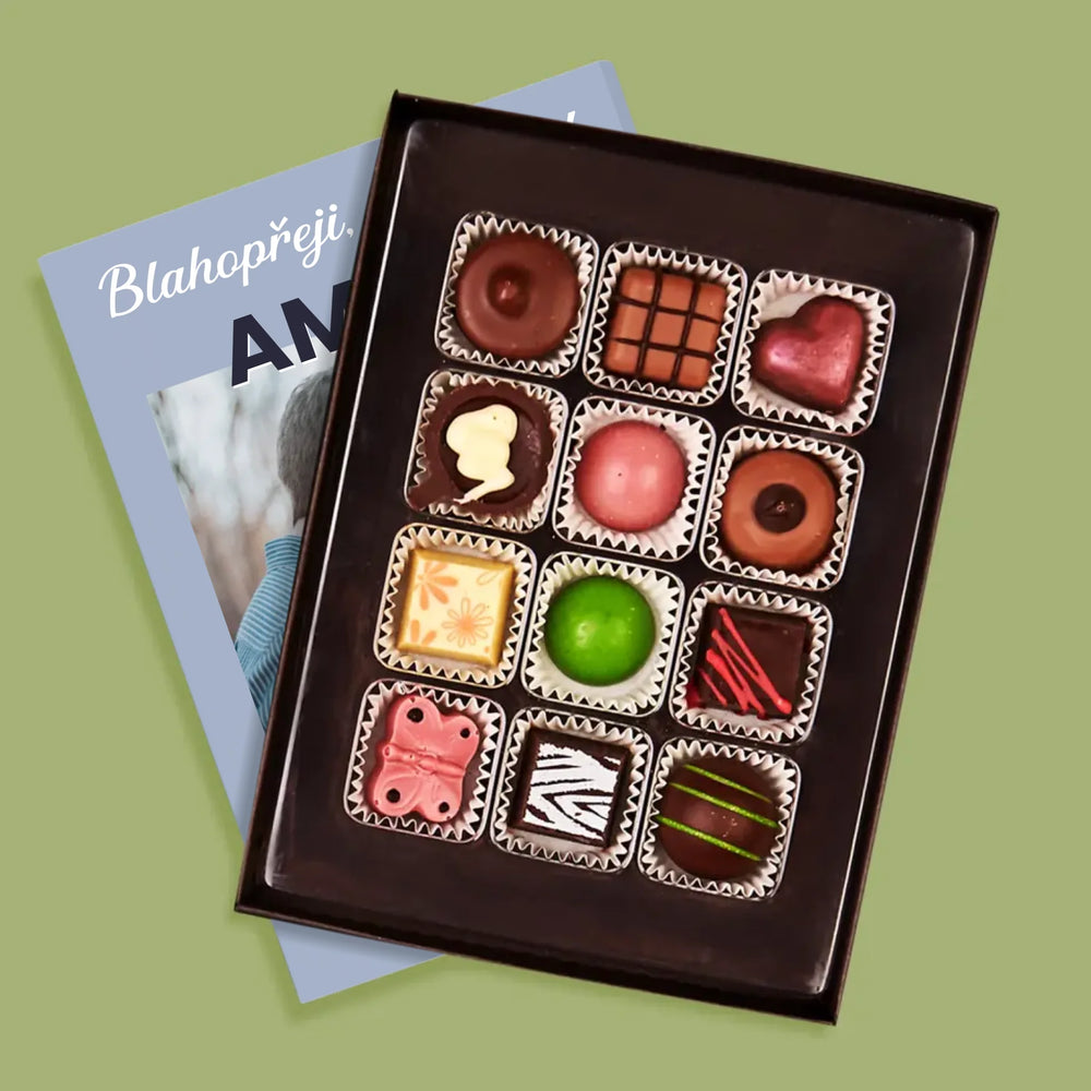 Lahodné belgické čokoládové pralinky v elegantní Krabici s naší vlastní personalizací.