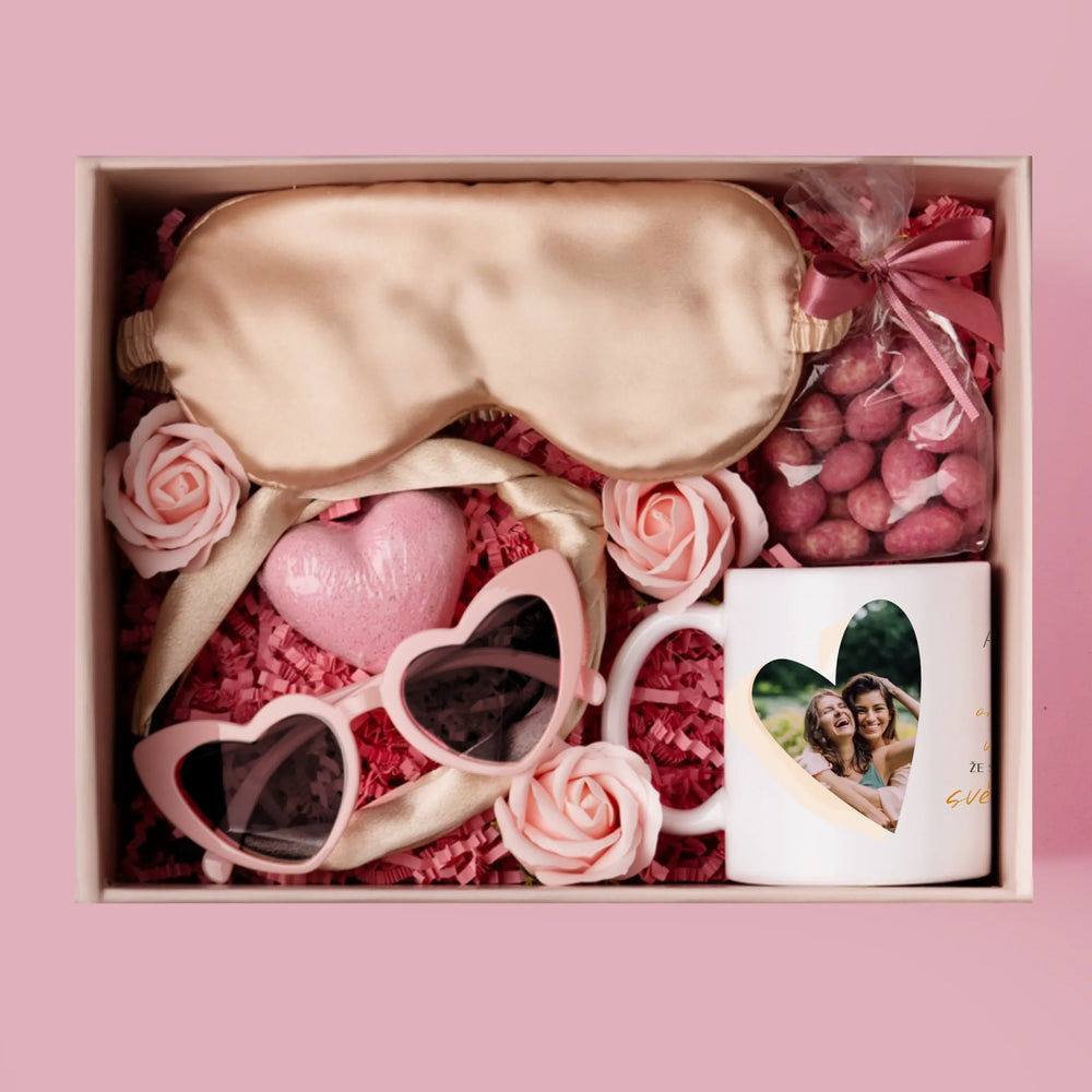 Sada obsahuje mandle v čokoládě, koupelovou bombu ve tvaru srdce, oční masku, brýle ve tvaru srdce a mydlové růže.