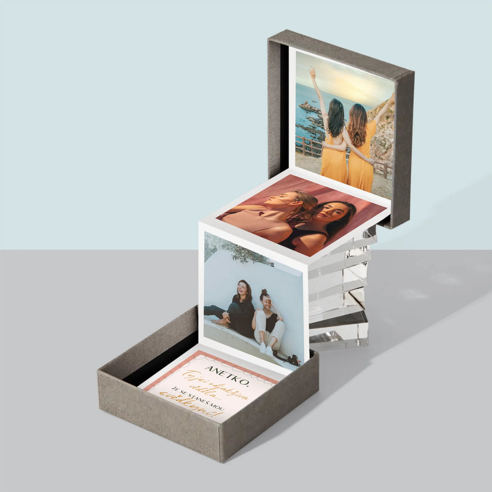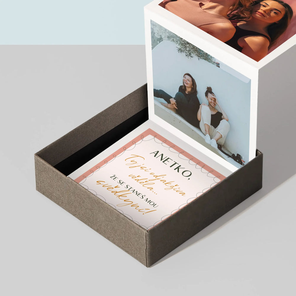 Sada harmoniky se třemi fotografiemi o rozměrech 6,68 x 6,68 cm a personalizovanými kartami s nápisem pro obdarovaného.