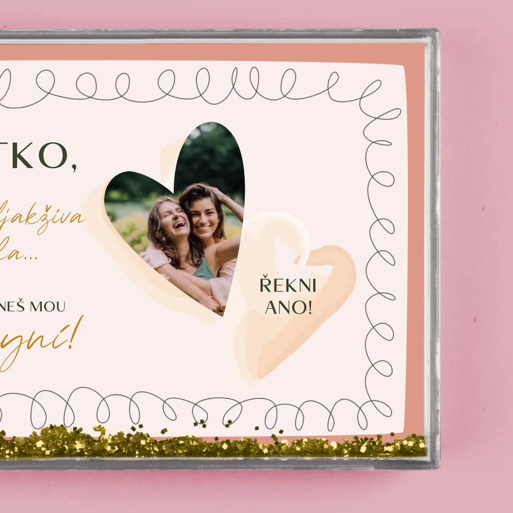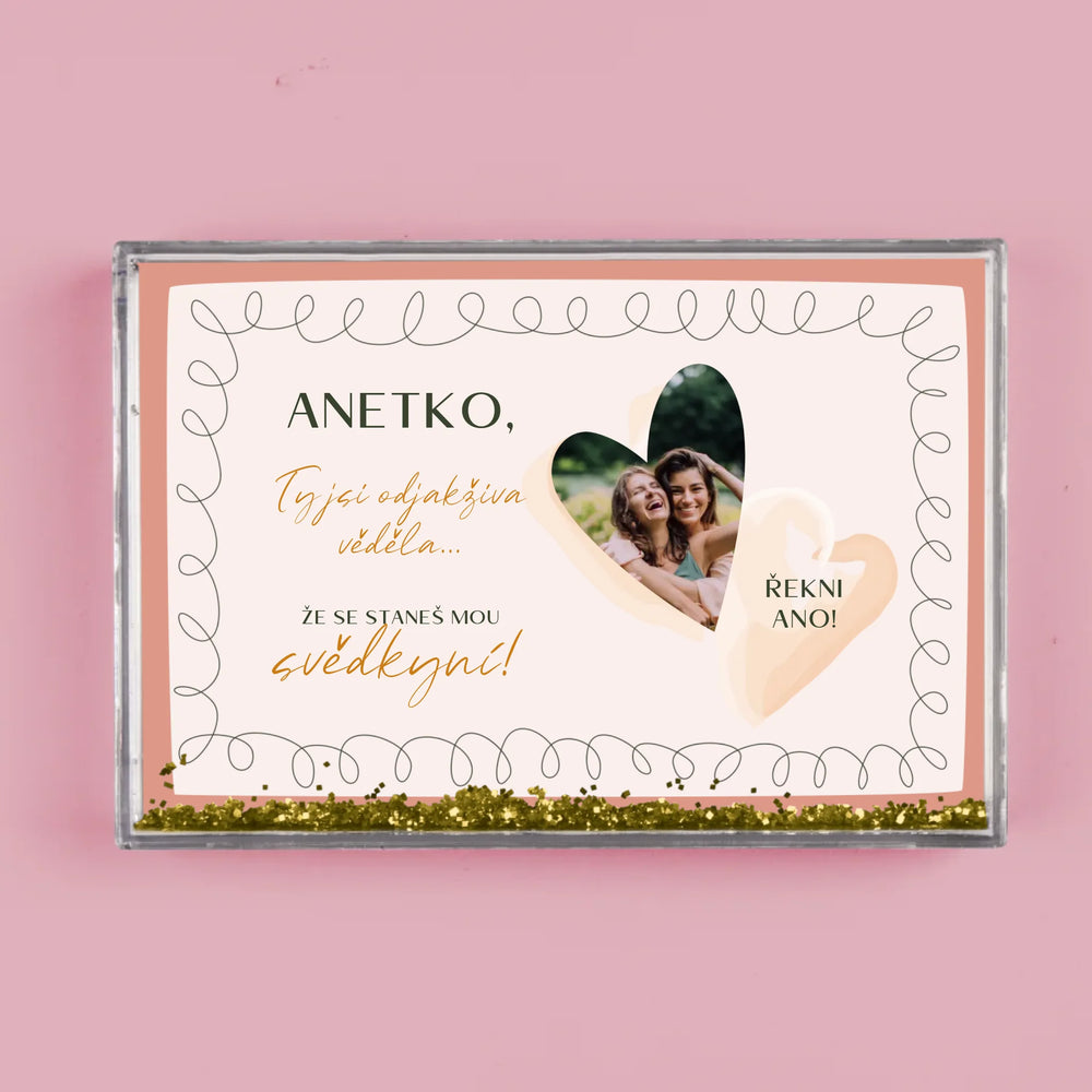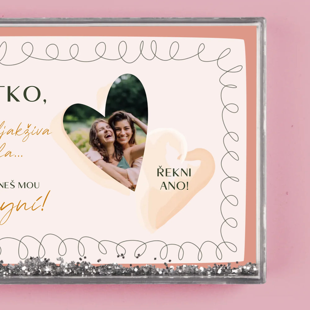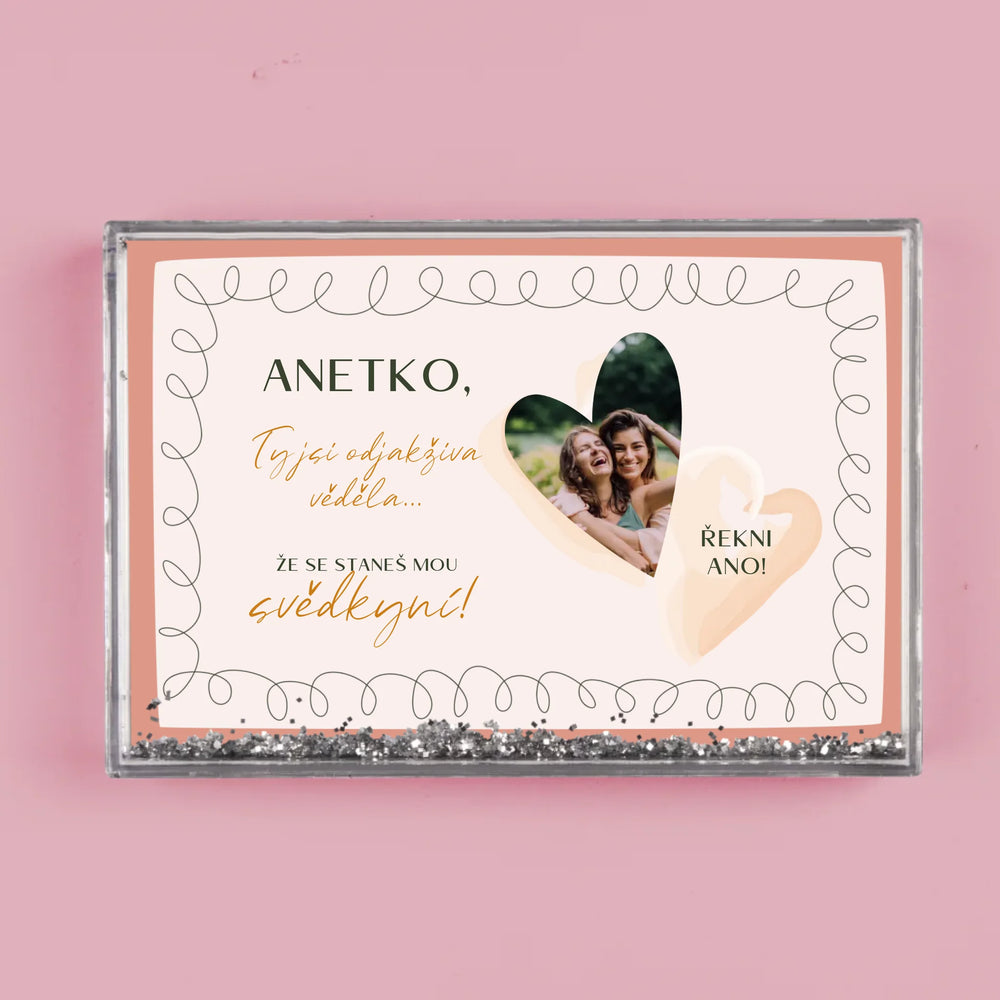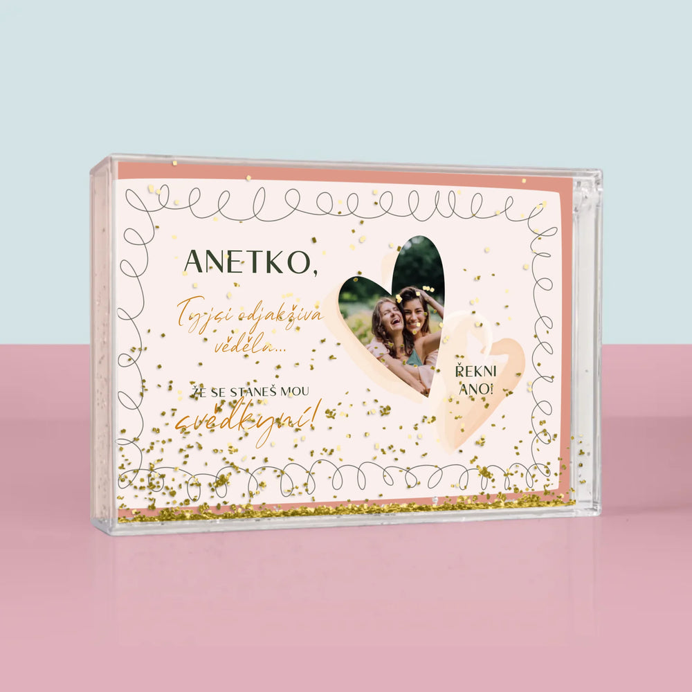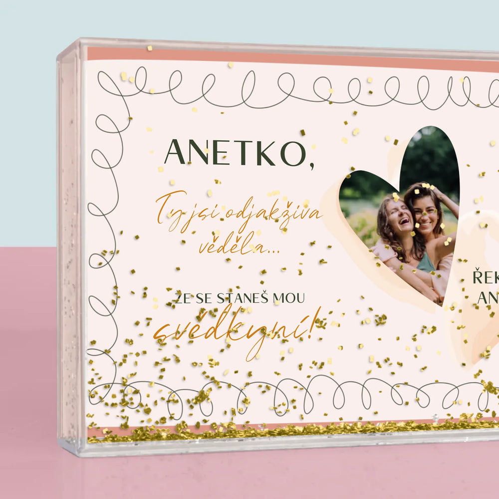 Sněžítko je vyrobeno z průhledného plastu, uvnitř je naplněno vodou a konfetami ve tvaru srdíček!