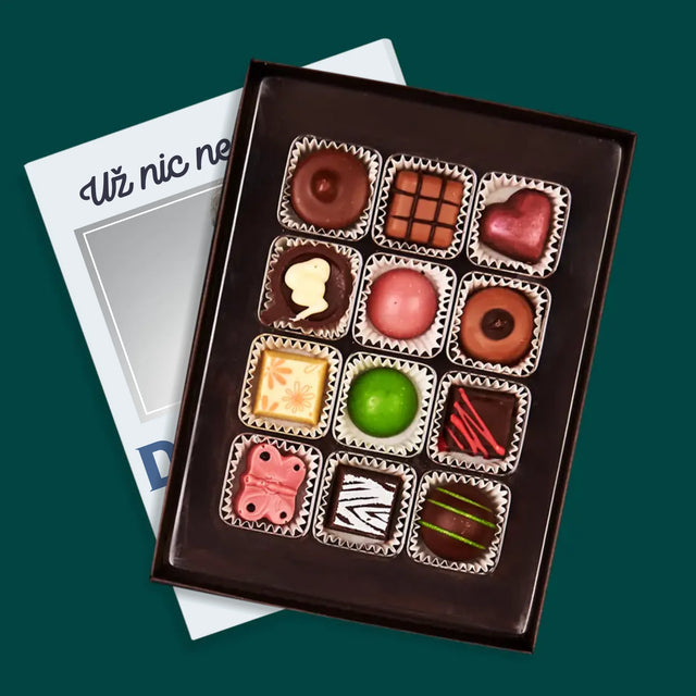 Lahodné belgické čokoládové pralinky v elegantní Krabici s naší vlastní personalizací.