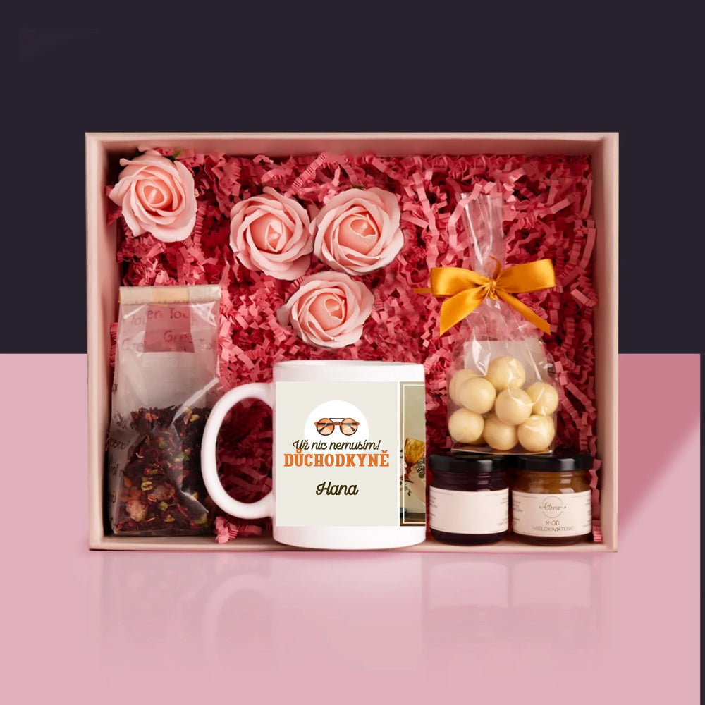 Fotka S Textem: Už Nic Nemusím! Důchodkyně - Dárková sada s hrnkem, čajem a sladkostmi