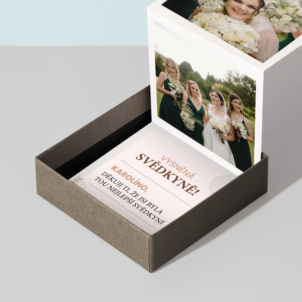 Sada harmoniky se třemi fotografiemi o rozměrech 6,68 x 6,68 cm a personalizovanými kartami s nápisem pro obdarovaného.