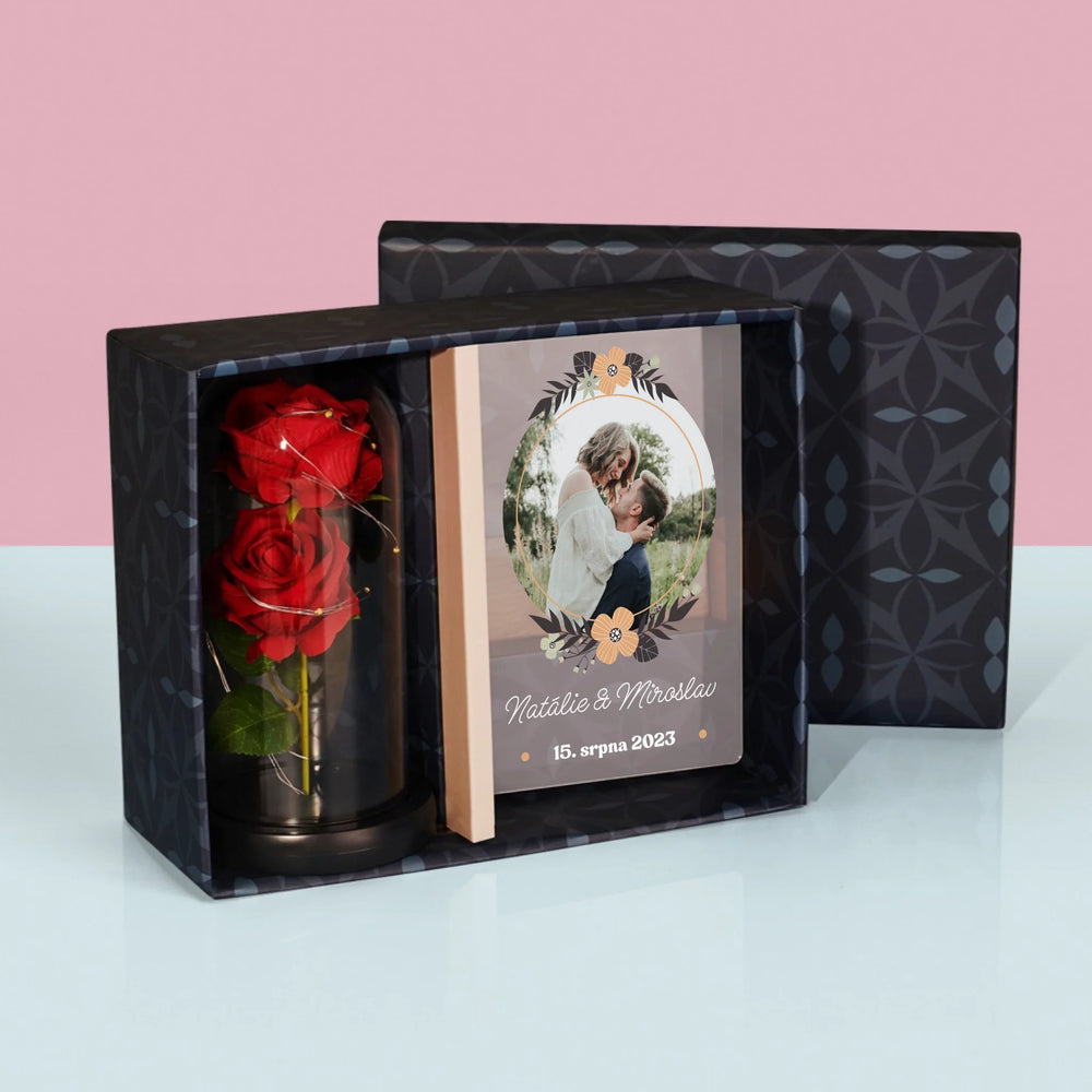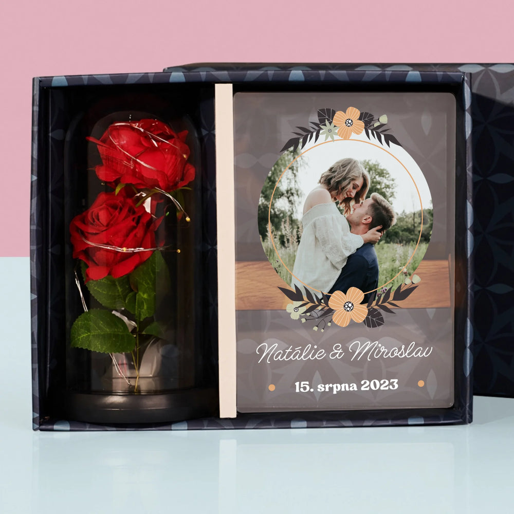 Fotka S Textem: Zamilovaní - Dárková sada s tiskem na akrylovém skle a věčnou růží