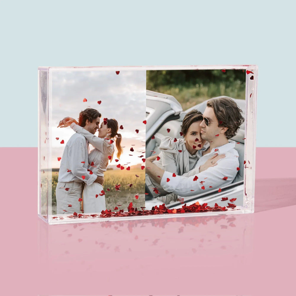 Sněžítko je vyrobeno z průhledného plastu, uvnitř je naplněno vodou a konfetami ve tvaru srdíček!