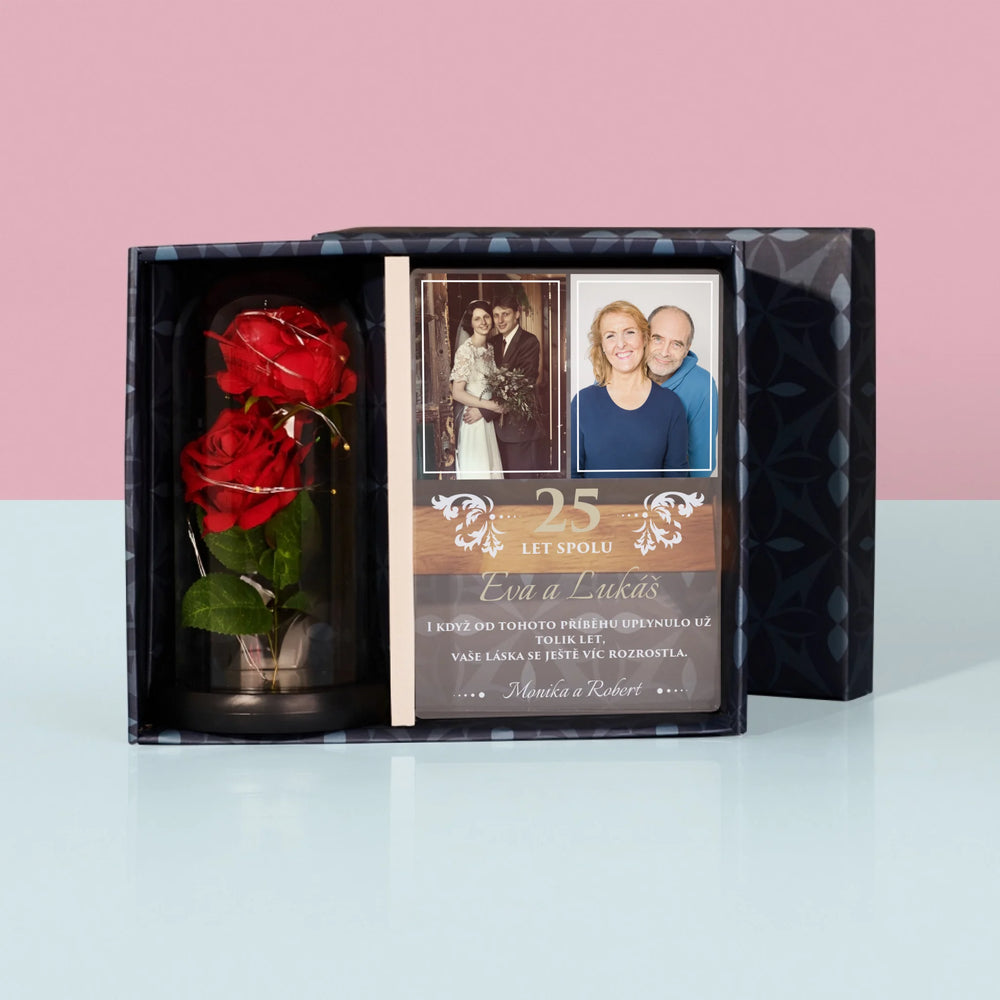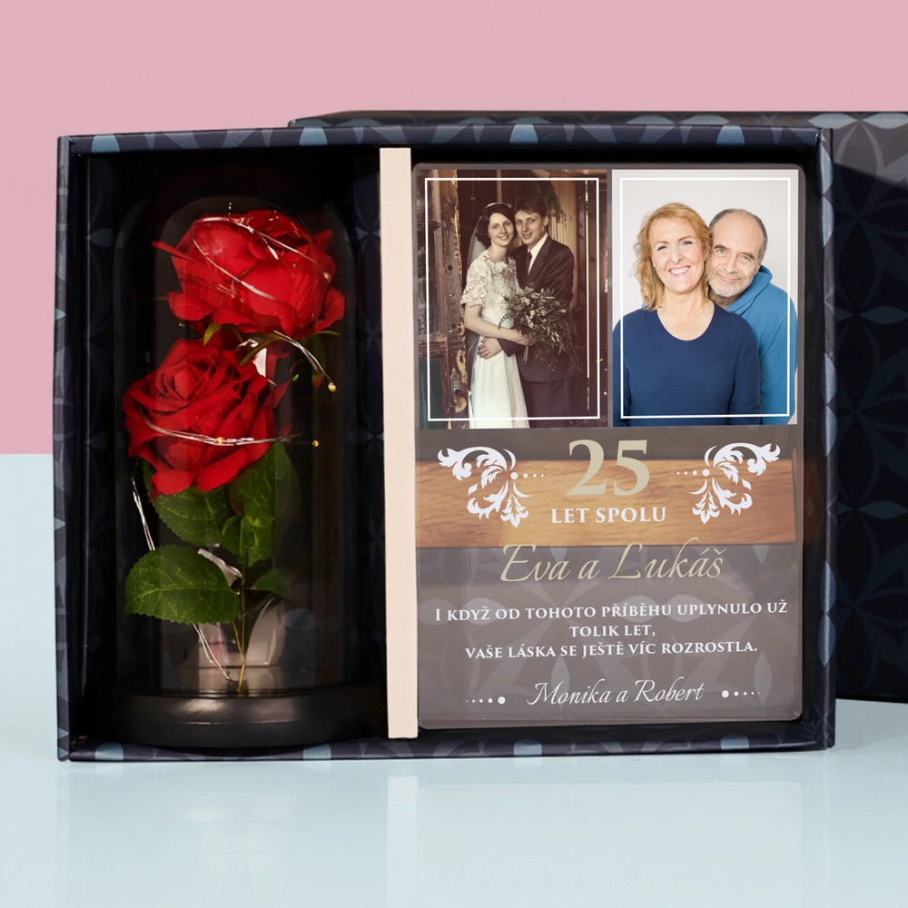 Fotokoláž: 25 Let Spolu - Dárková sada s tiskem na akrylovém skle a věčnou růží