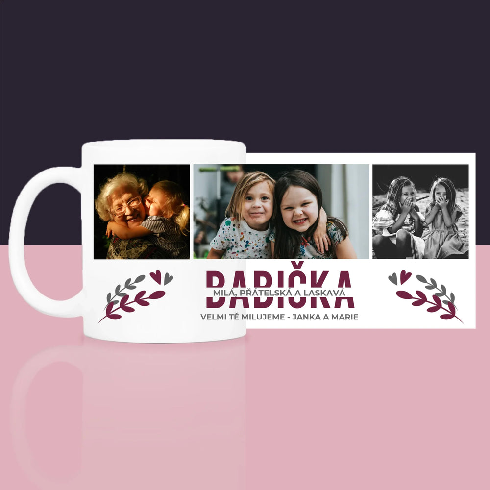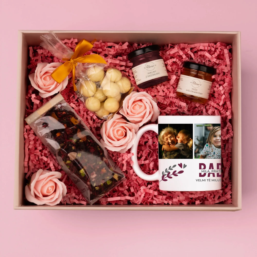 Fotokoláž: Babička - Dárková sada s hrnkem, čajem a sladkostmi