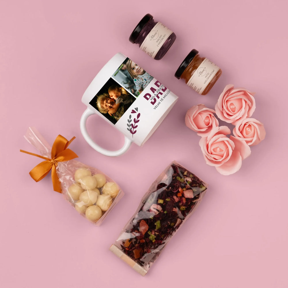 Krásná dárková sada s hrnkem s možnostmi personalizace a doplňků dle vašeho výběru – čaje a sladkosti.