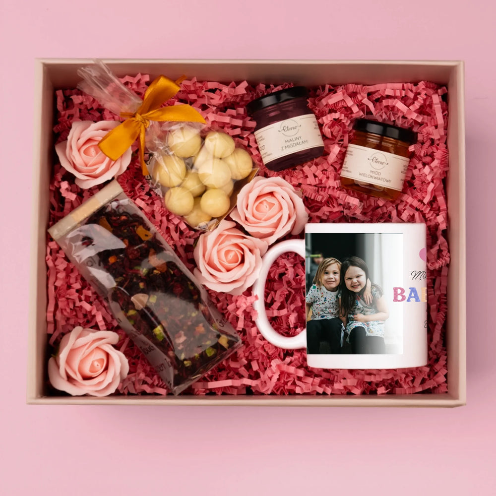 Fotokoláž: Miluji Tě, Babi - Dárková sada s hrnkem, čajem a sladkostmi