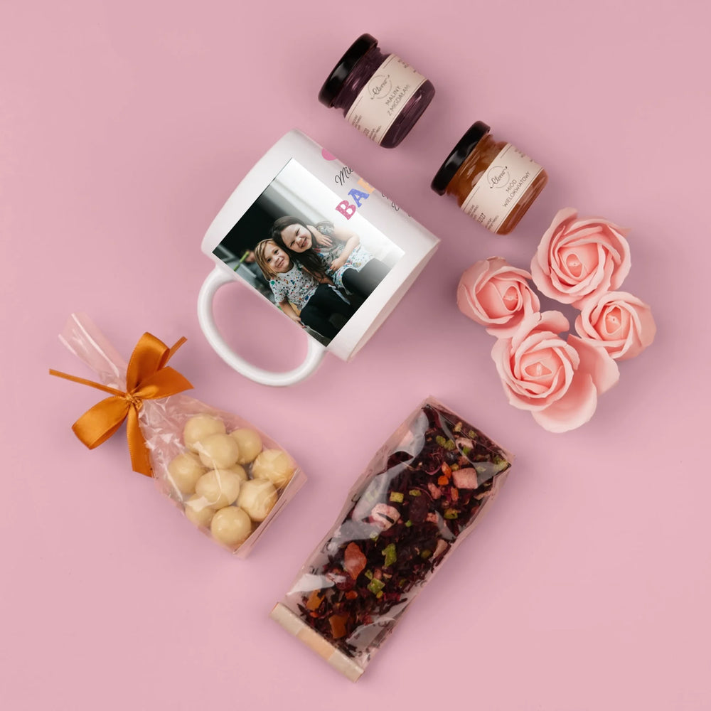 Krásná dárková sada s hrnkem s možnostmi personalizace a doplňků dle vašeho výběru – čaje a sladkosti.