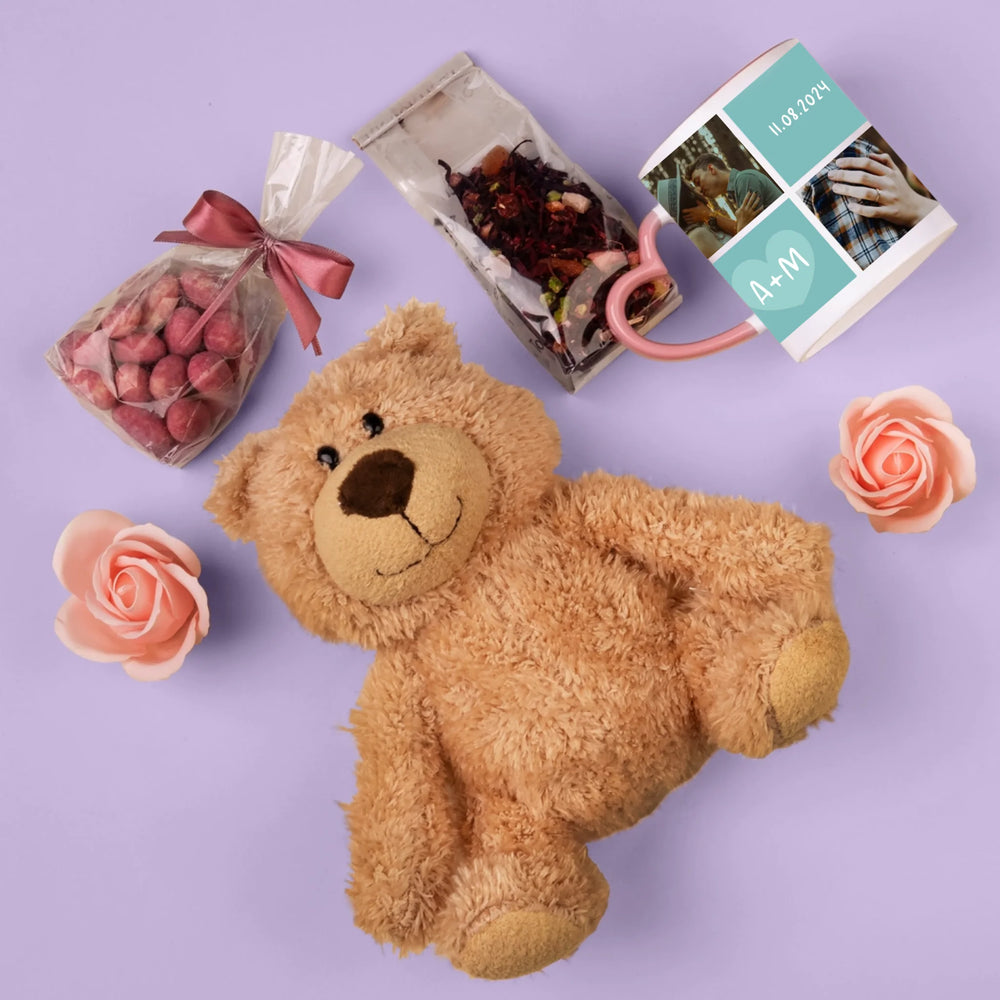 Krásná dárková sada s hrnkem s možnostmi personalizace dle vašeho výběru, okouzlujícím plyšovým medvídkem a sladkostmi.