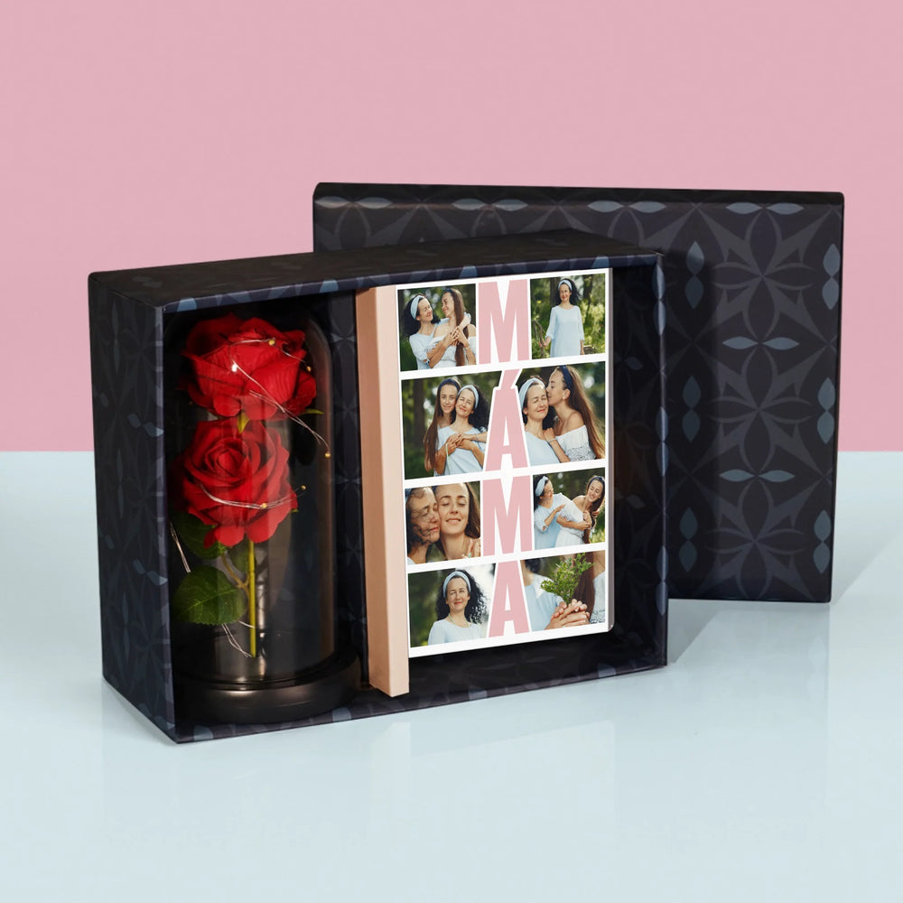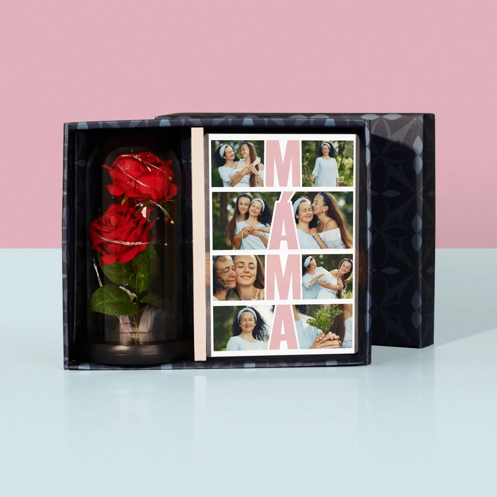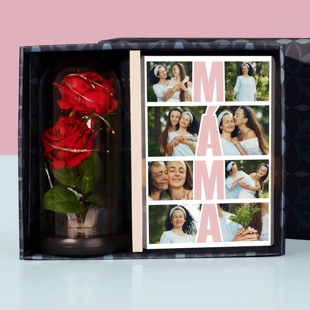 Fotokoláž: Máma Fotokoláž - Dárková sada s tiskem na akrylovém skle a věčnou růží