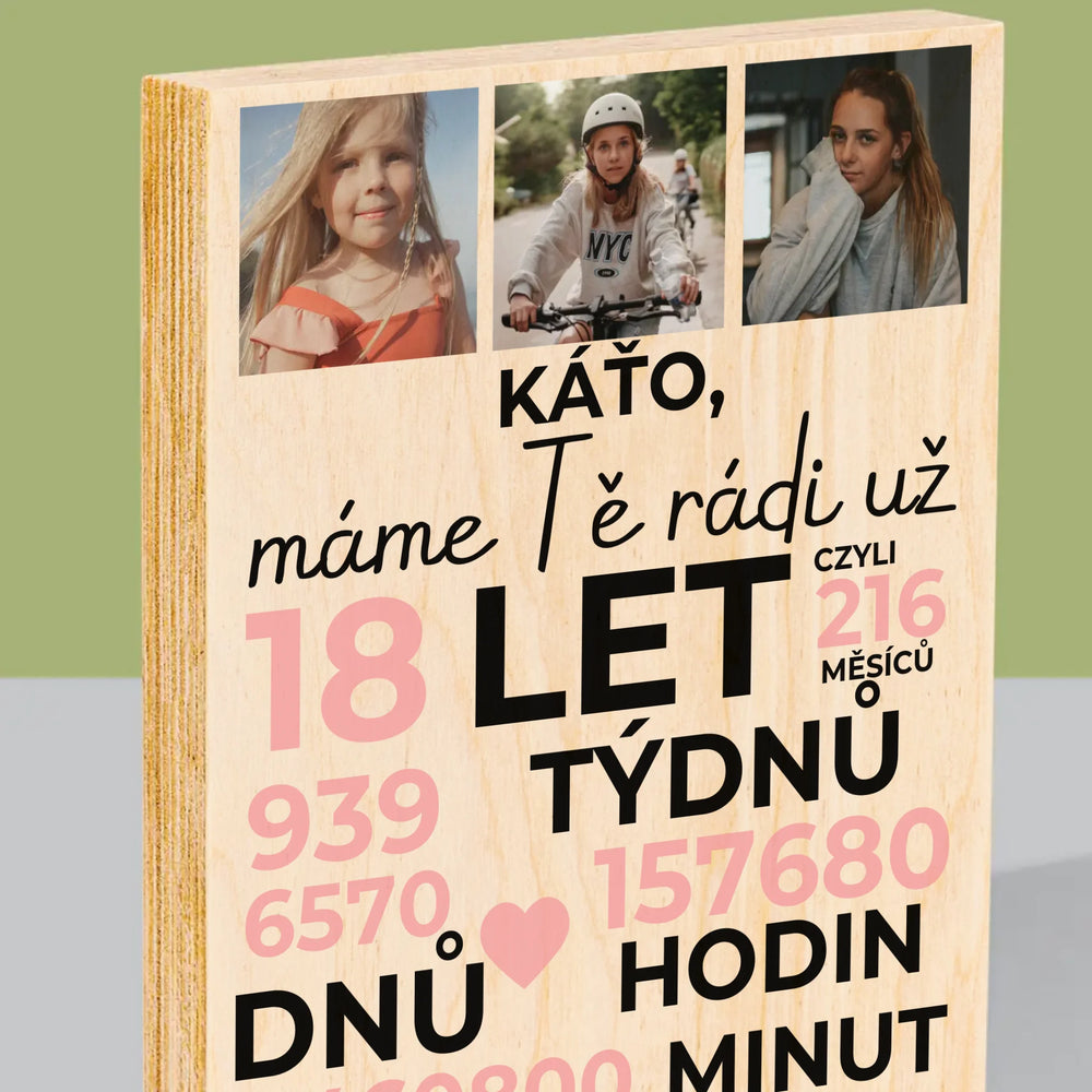 Fotokoláž: Máme Tě Rádi Už 18 Let - Tisk na dřevo - vertikální