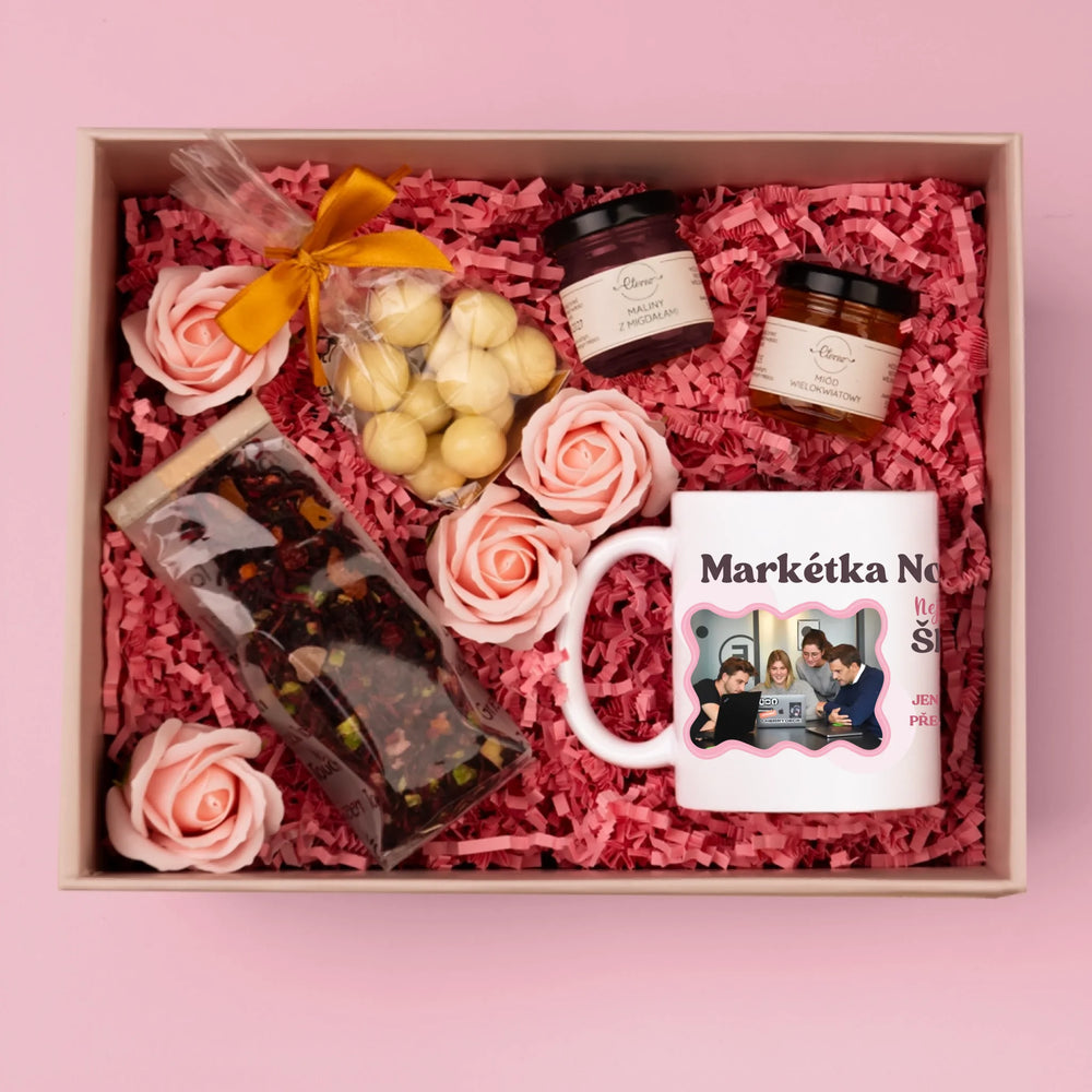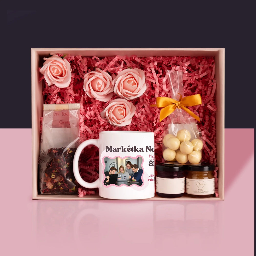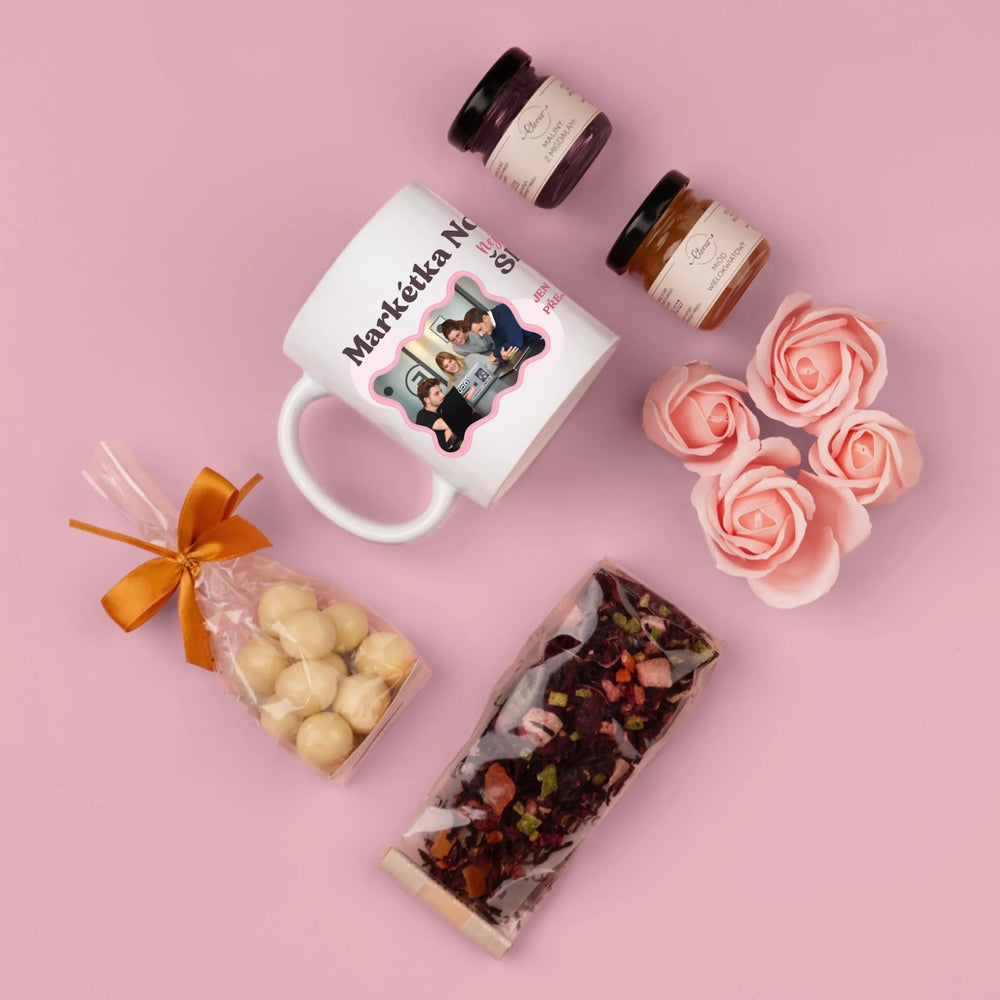 Krásná dárková sada s hrnkem s možnostmi personalizace a doplňků dle vašeho výběru – čaje a sladkosti.
