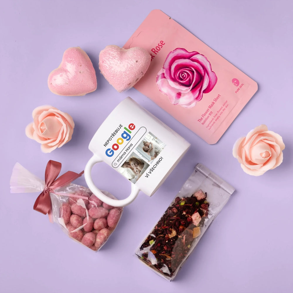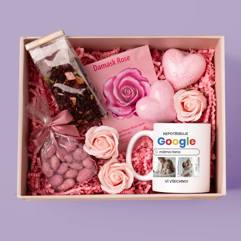Fotokoláž: Nepotřebuji Google - Dárková sada s hrnkem a růžovým spa