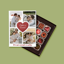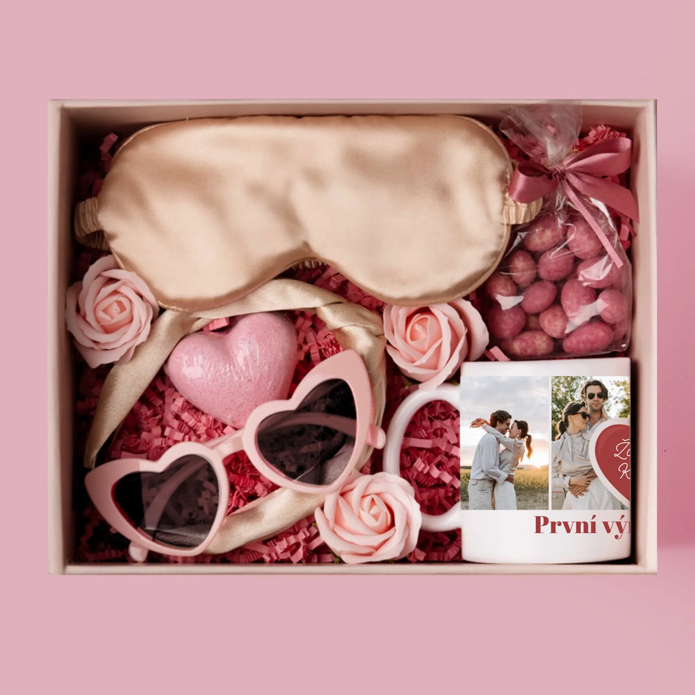 Fotokoláž: První Výročí Srdce - Dárková sada s hrnkem a růžovým spa