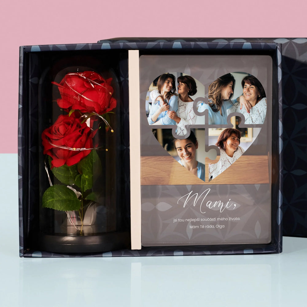 Fotokoláž: Puzzle Srdce Pro Mámu - Dárková sada s tiskem na akrylovém skle a věčnou růží