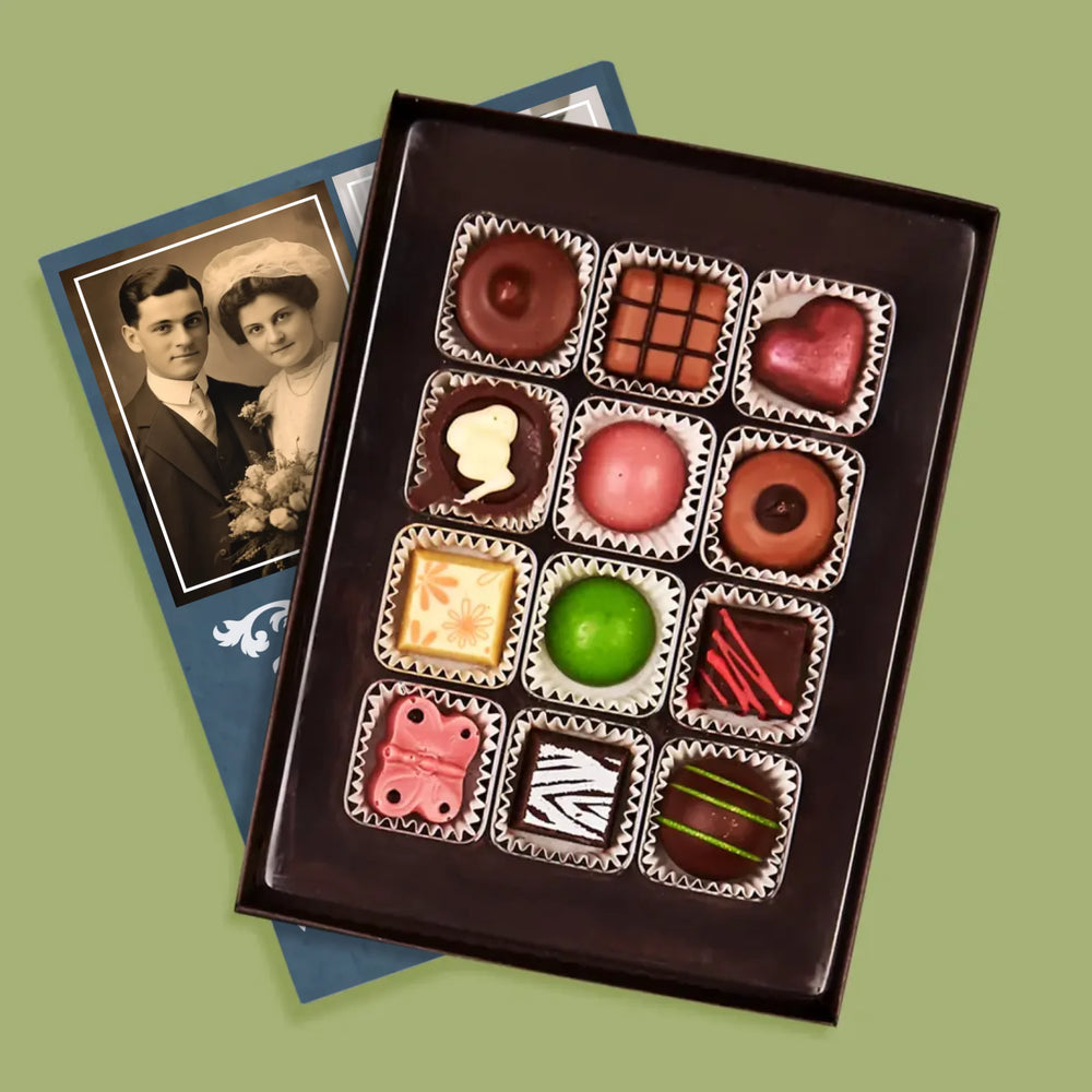 Lahodné belgické čokoládové pralinky v elegantní Krabici s naší vlastní personalizací.
