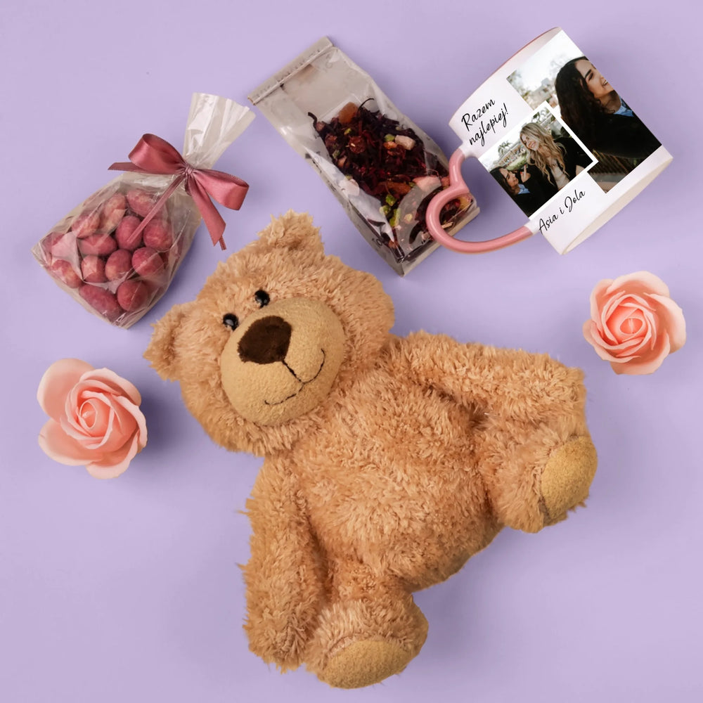 Fotokoláž: Spolu Nejlíp - Dárková sada s hrnkem, plyšovým medvídkem a sladkostmi