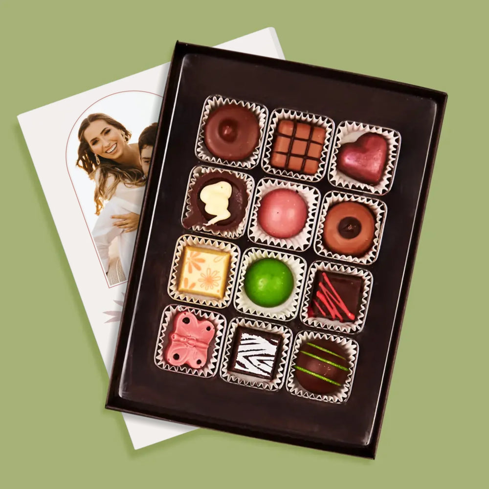 Lahodné belgické čokoládové pralinky v elegantní Krabici s naší vlastní personalizací.