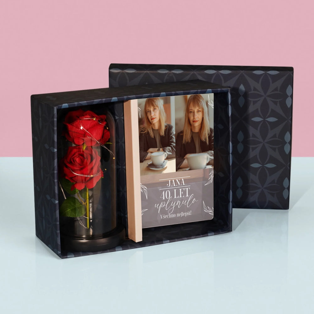 Fotokoláž: Uplynulo 40 Let - Dárková sada s tiskem na akrylovém skle a věčnou růží