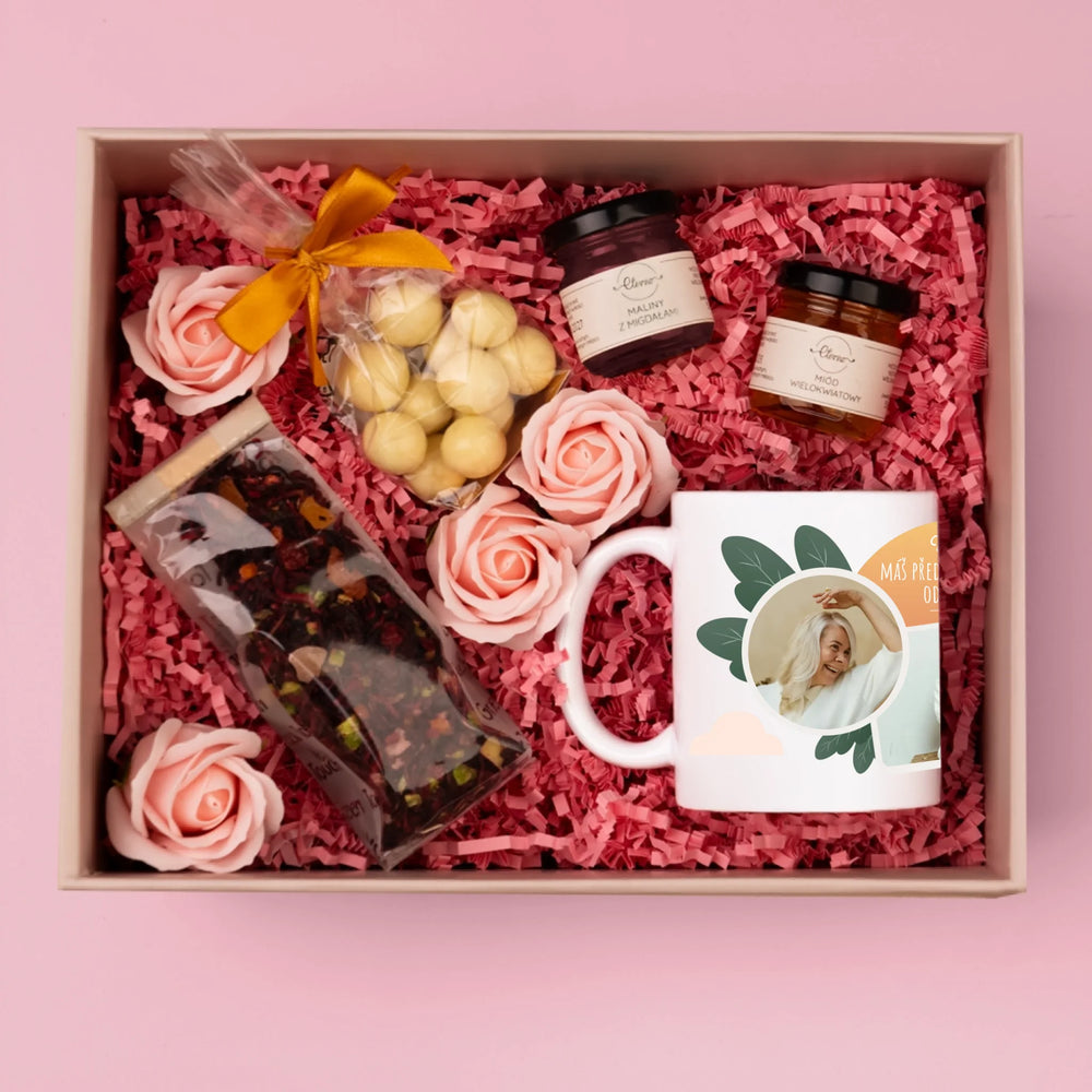 Krásná dárková sada s hrnkem s možnostmi personalizace a doplňků dle vašeho výběru – čaje a sladkosti.
