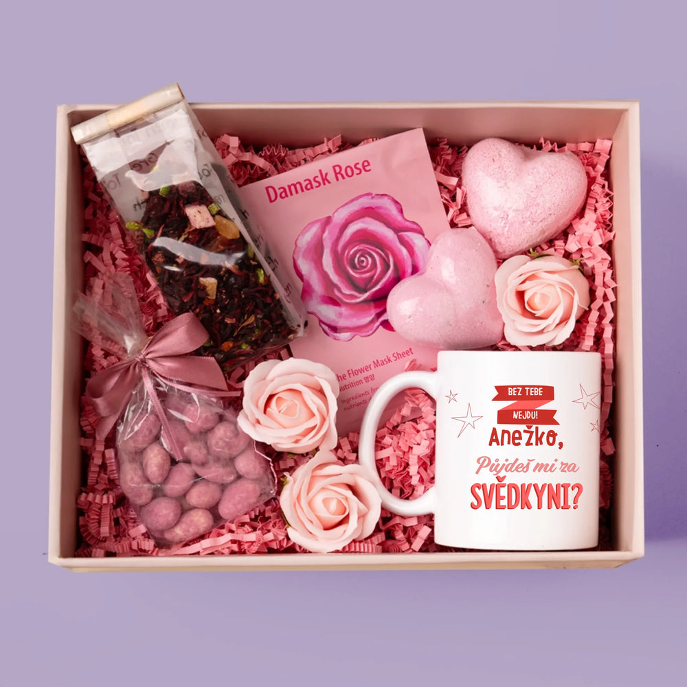 Sada obsahuje mandle v čokoládě, ovocný čaj, pleťovou masku, koupelovou bombu ve tvaru srdce a mydlové růže.