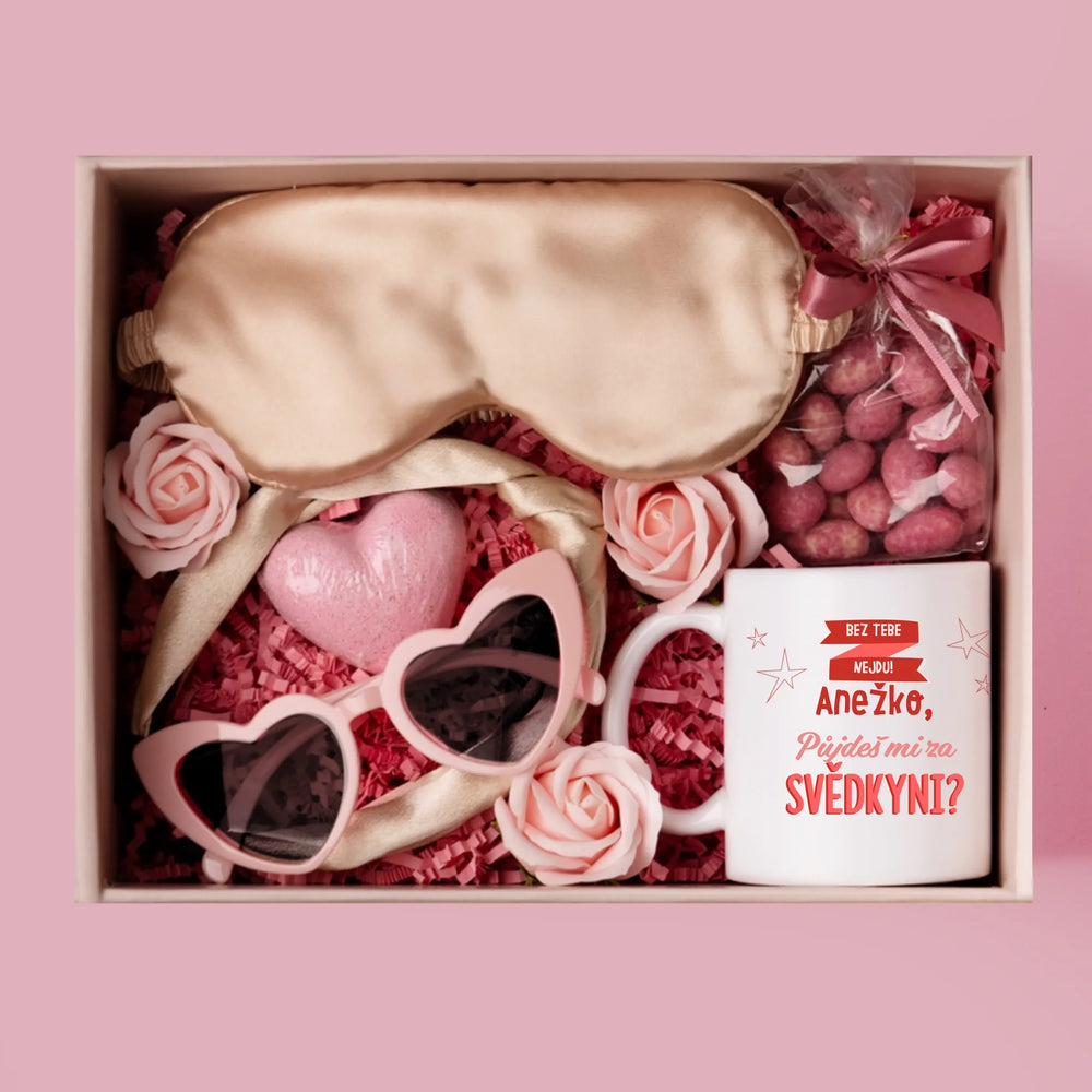 Sada obsahuje mandle v čokoládě, koupelovou bombu ve tvaru srdce, oční masku, brýle ve tvaru srdce a mydlové růže.