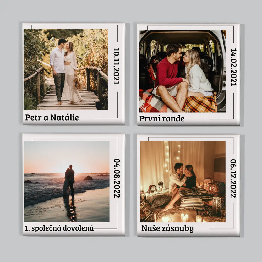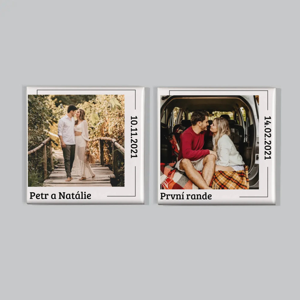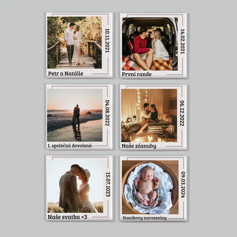 Sada magnetů s vašimi fotografiemi a personalizovanými popisky.