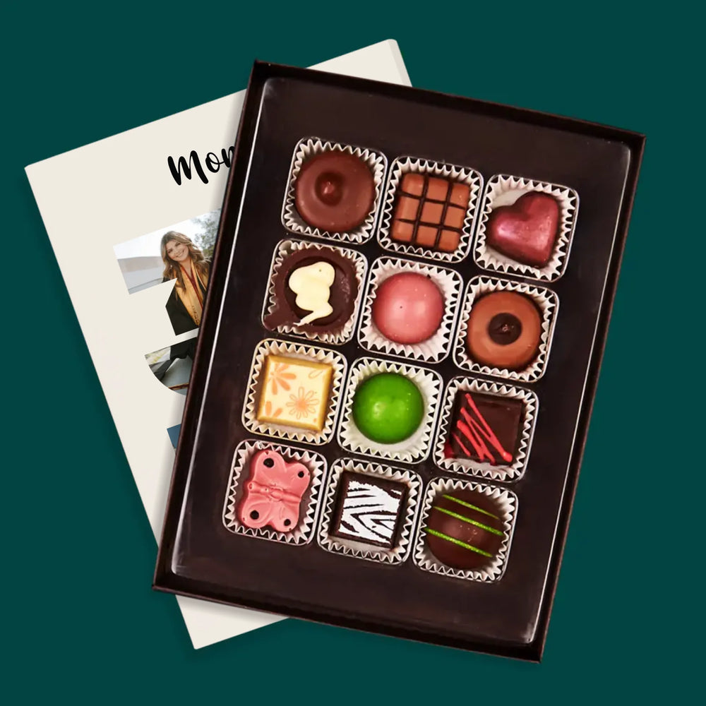 Lahodné belgické čokoládové pralinky v elegantní Krabici s naší vlastní personalizací.