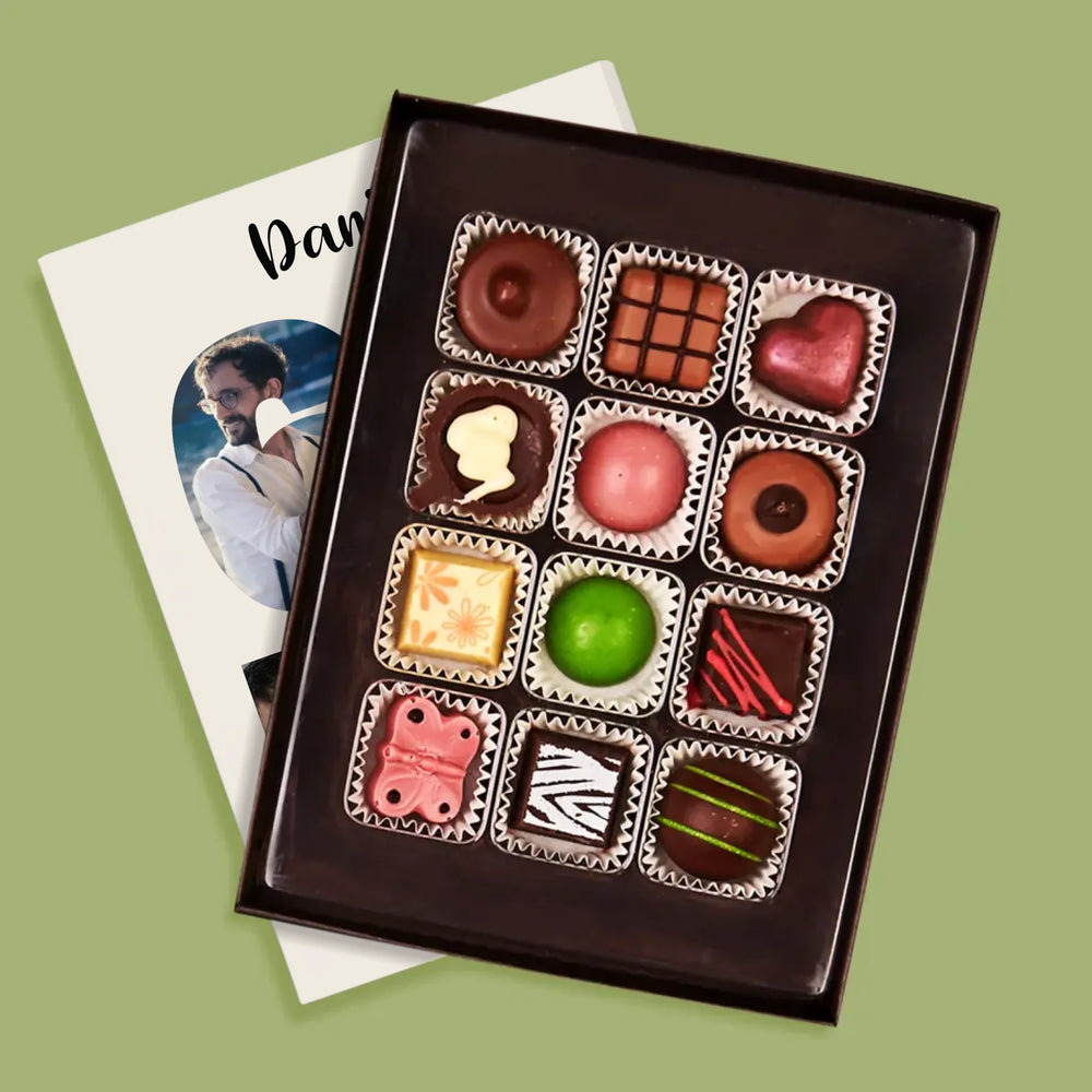Lahodné belgické čokoládové pralinky v elegantní Krabici s naší vlastní personalizací.