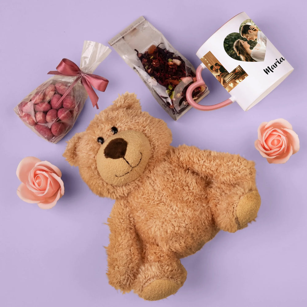 Krásná dárková sada s hrnkem s možnostmi personalizace dle vašeho výběru, okouzlujícím plyšovým medvídkem a sladkostmi.